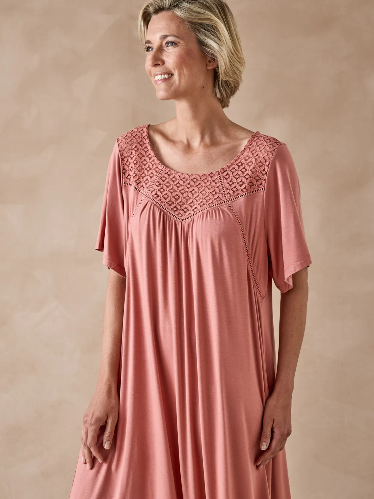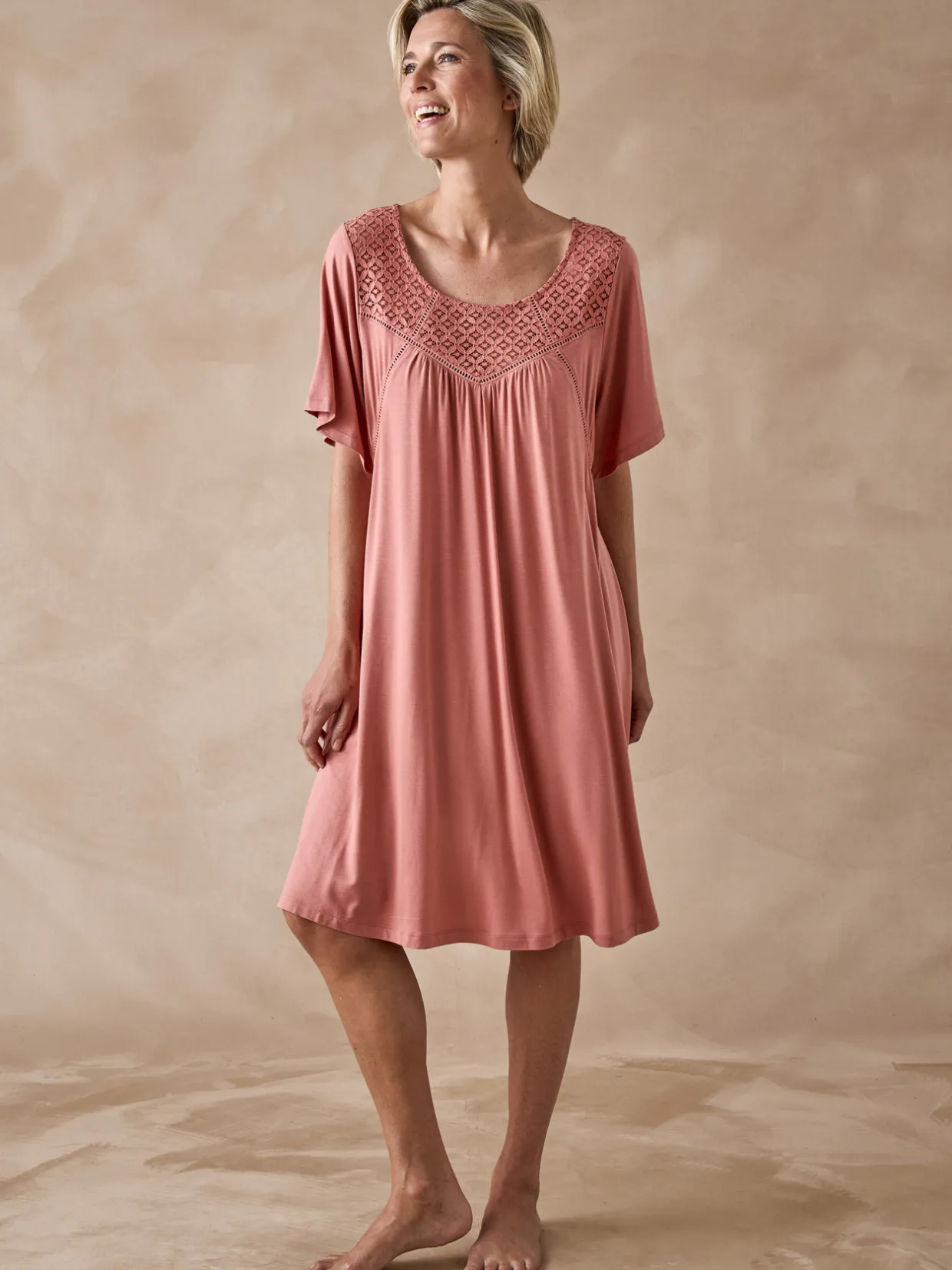 Une tonalité de rose au charme un rien romantique pour cette chemise de nuit courte à la coupe évasée aussi féminine que confortable.