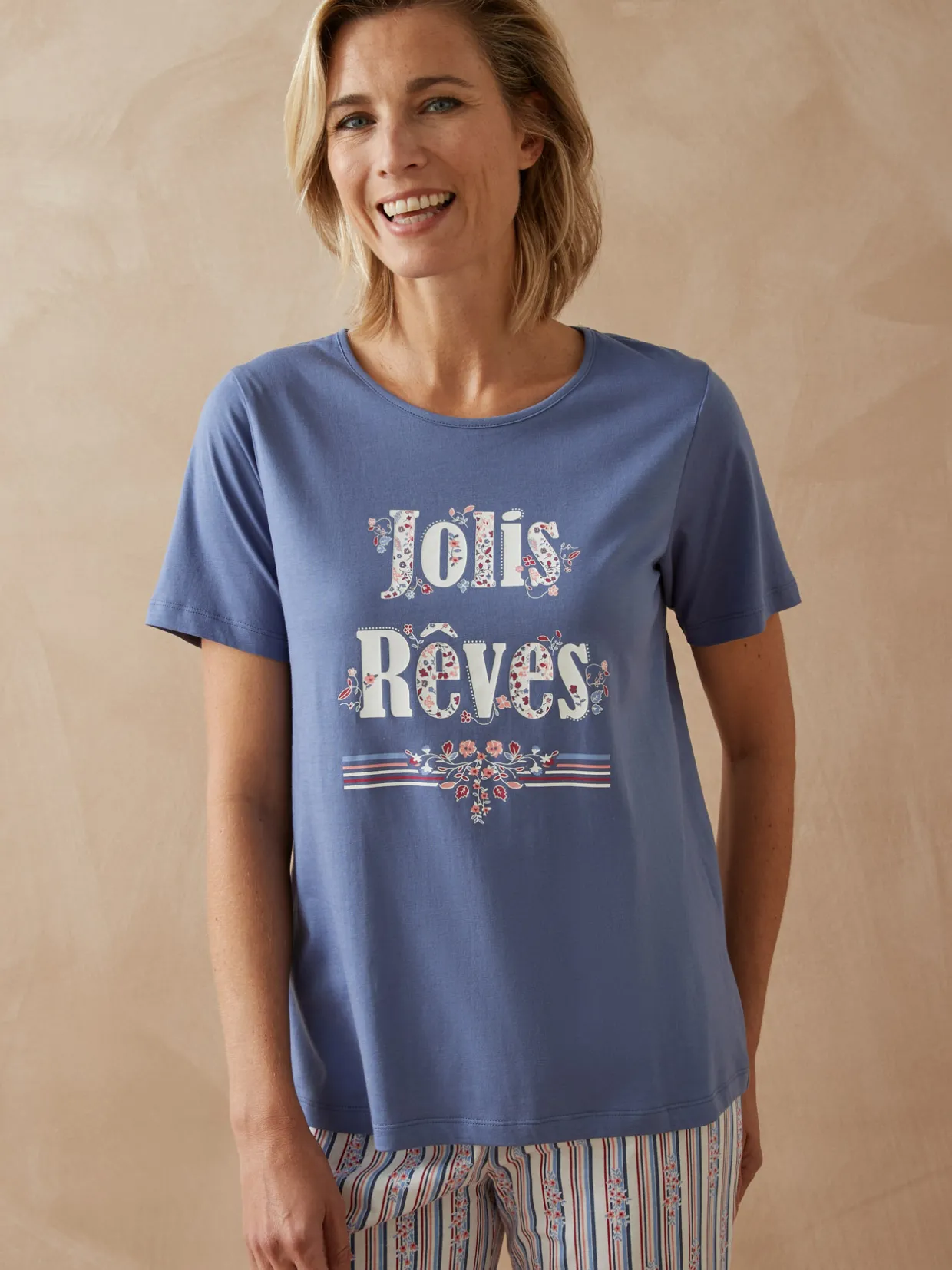 Associez ce tee-shirt de pyjama au pantacourt ou au pantalon coordonné et composez le pyjama idéal ! Choississez vos imprimés, mixez les tailles… tout est permis !