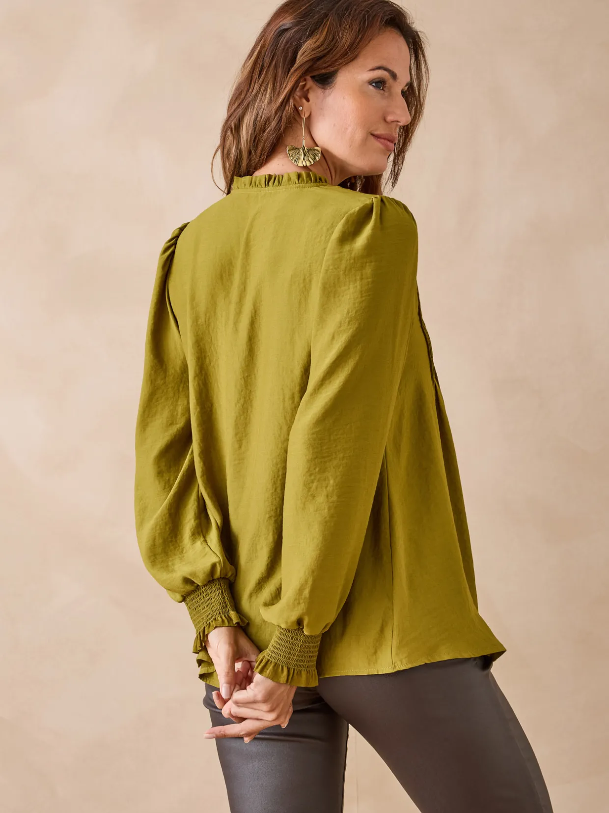 Une tonalité actuelle, un ruchet raffiné, de petits plis très féminins et un tissu satin… vrai cumul de bons points pour cette blouse unie. Parfaite associée à un petit gilet sans manches : la grande tendance !