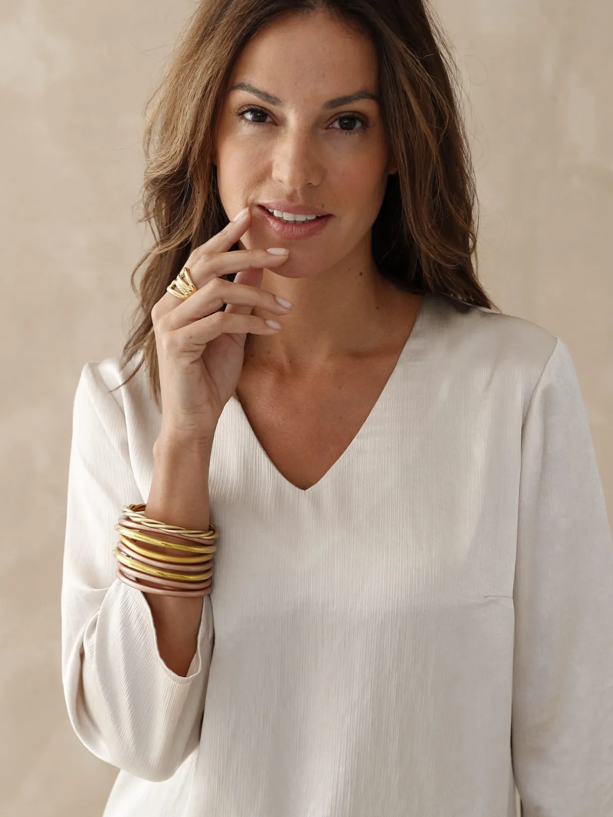 Cette blouse effet satin est conçue pour s’adapter à toutes les moprhologies : petites et grandes tailles.