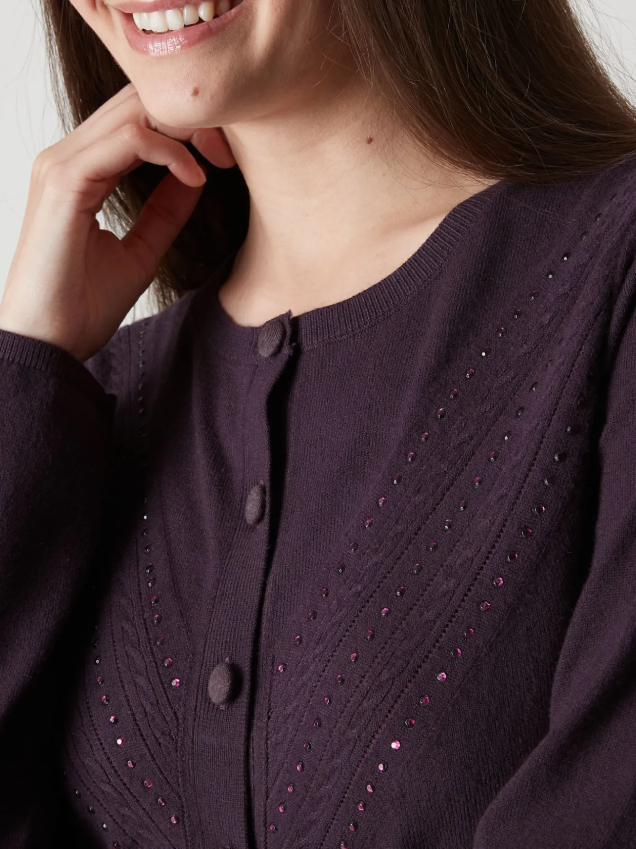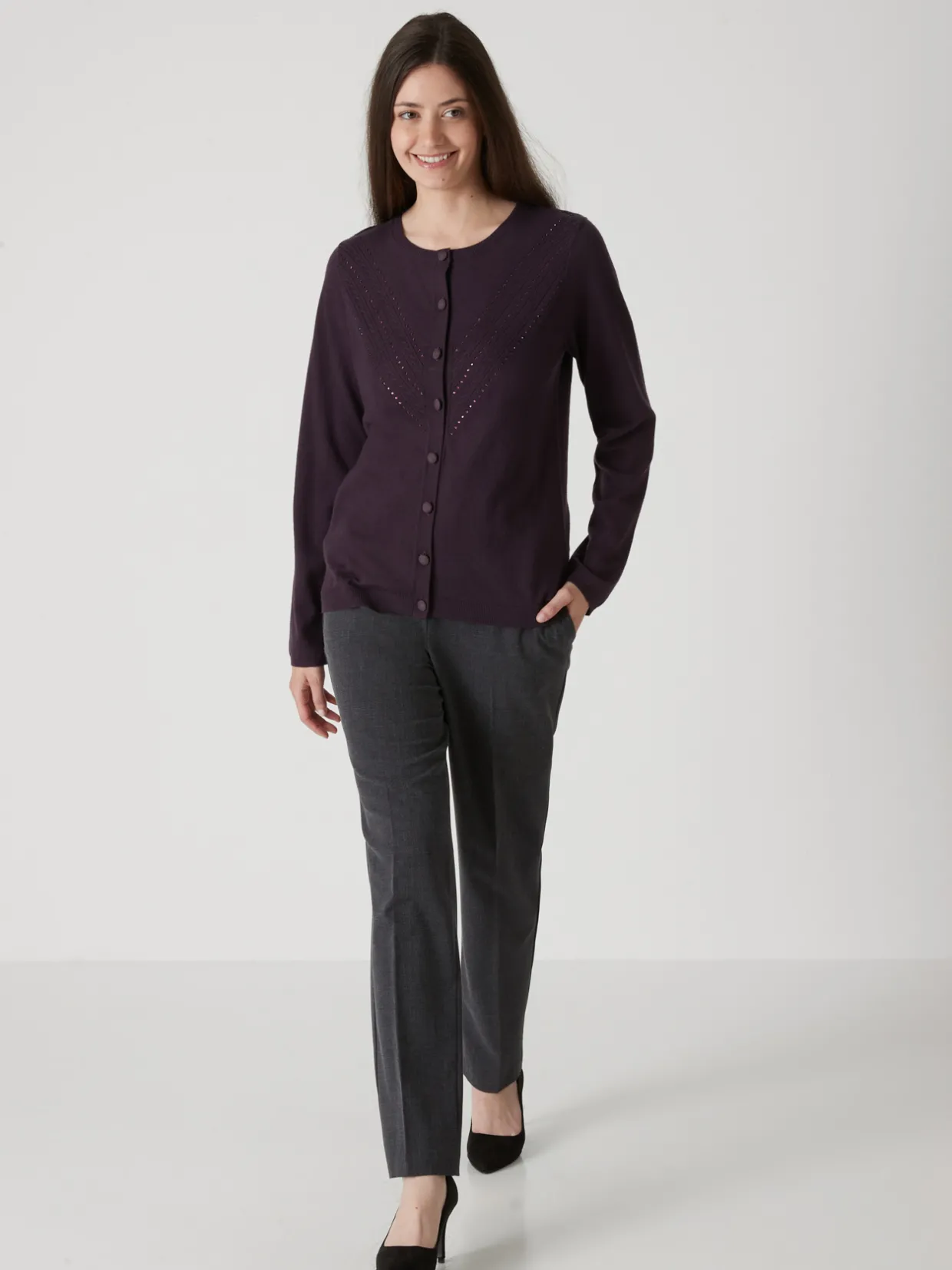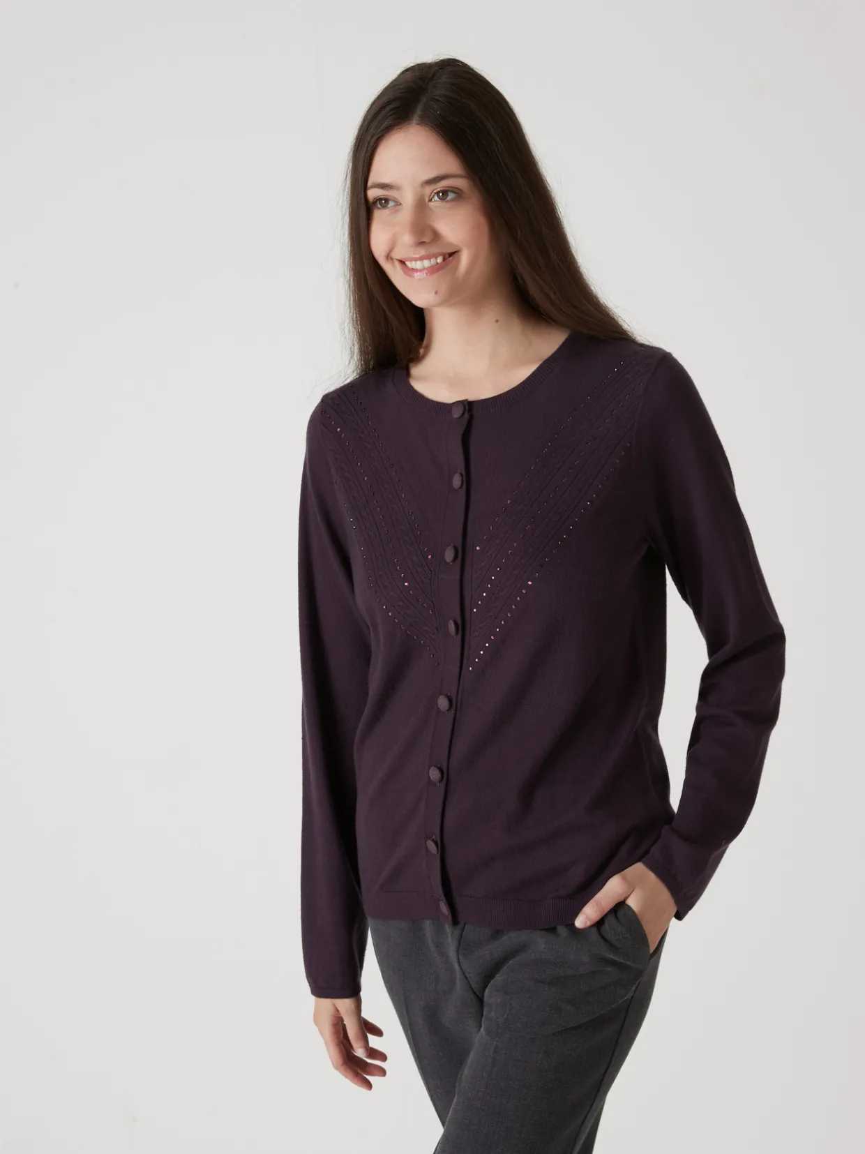 Résolument féminins les petits rivets qui se mêlent aux jeux de points fantaisie formant un V sur le devant de ce cardigan. Une joli façon de se démarquer !