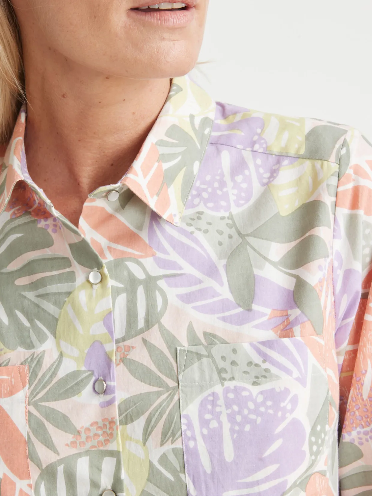 Un chemisier imprimé à porter manches longues ou manches retoussées, dans un style décontracté. Le détail très actuel de ce chemisier coton : les boutons métal.