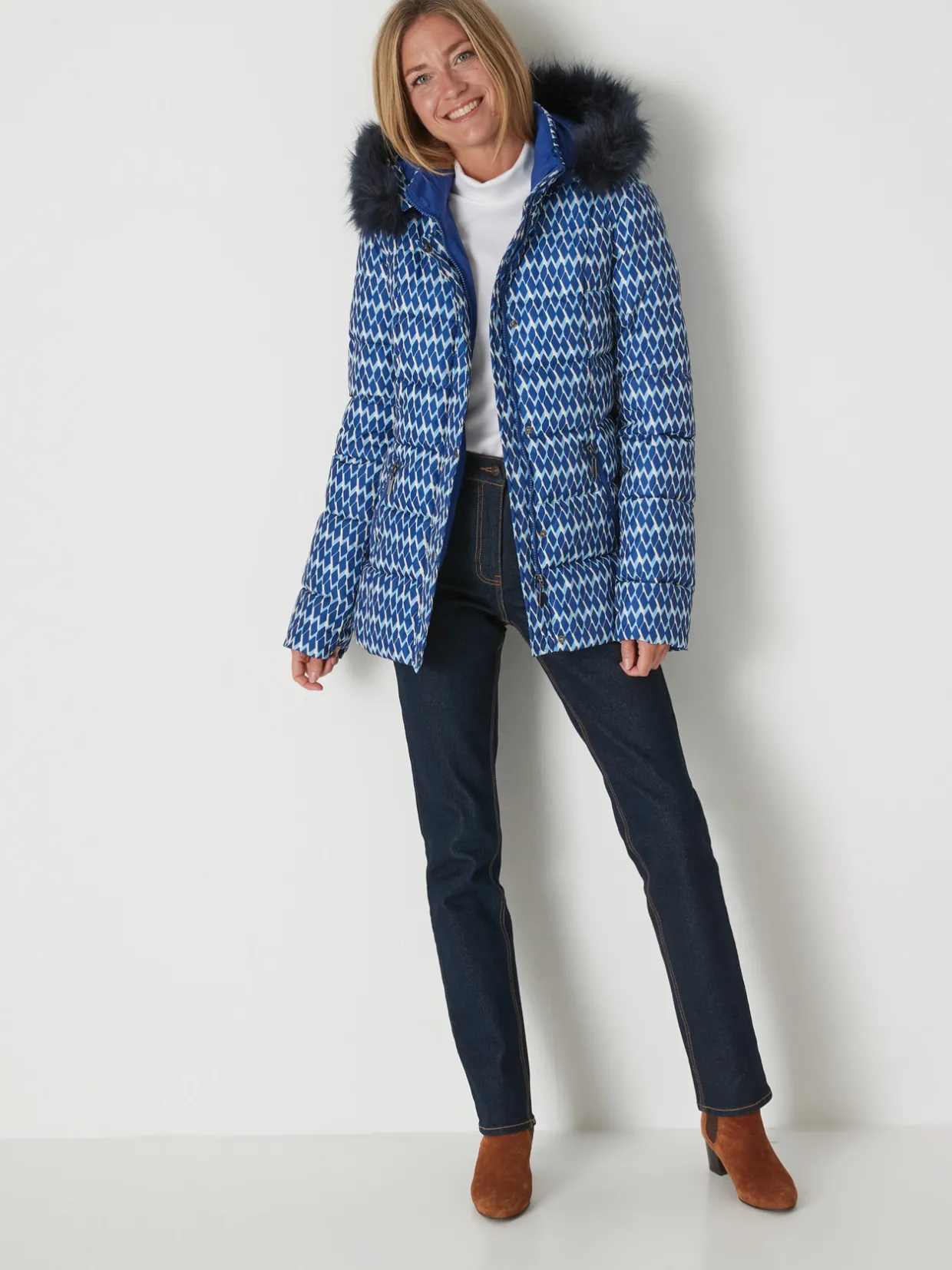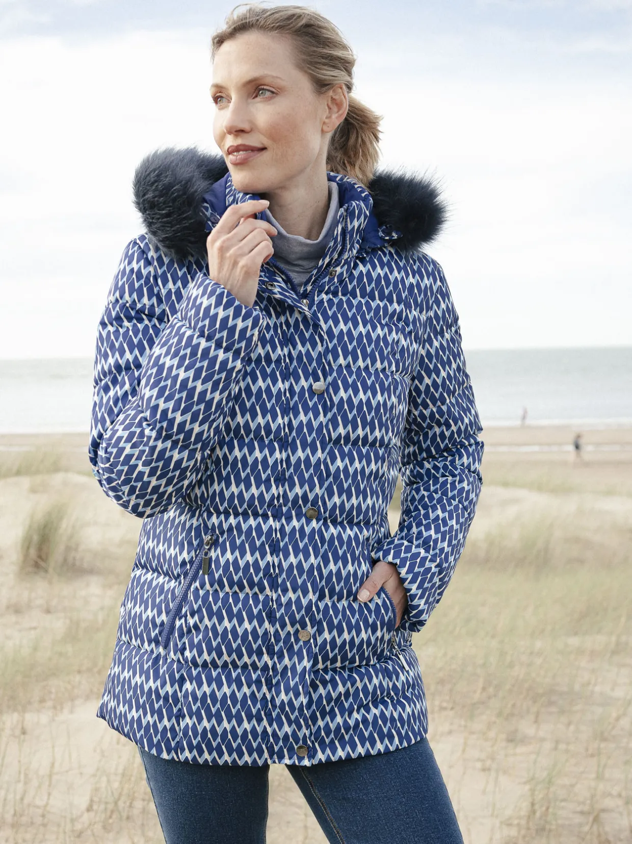 Cette parka imprimée femme est conçue pour s’adapter à toutes les morphologies : petites et grandes tailles.
