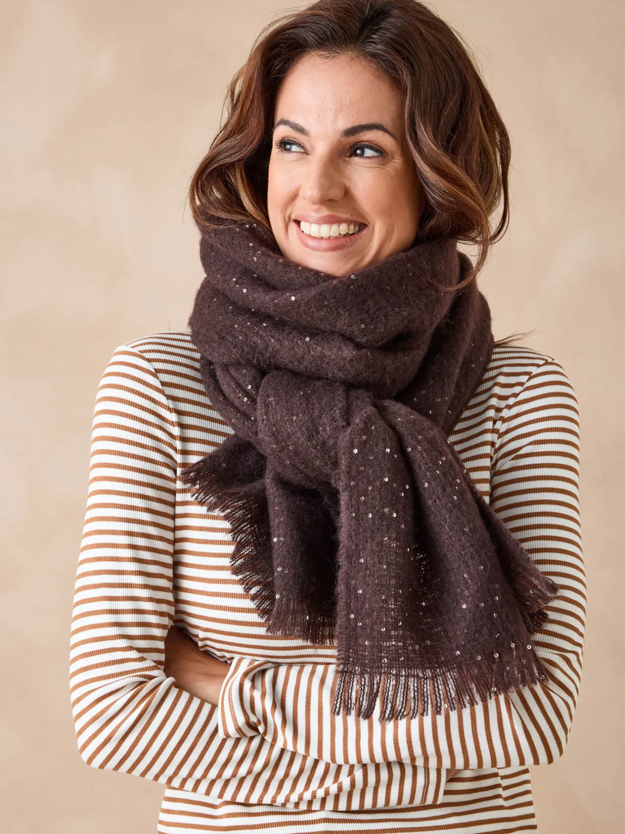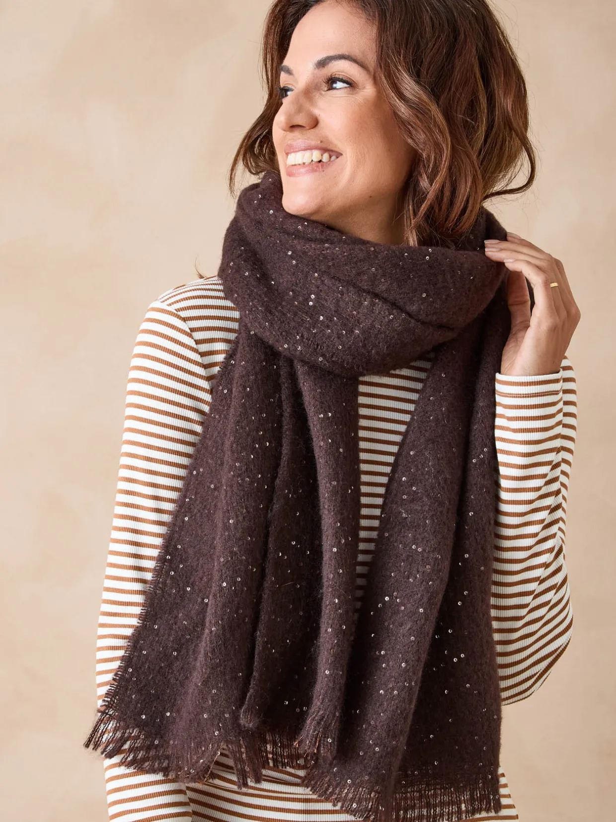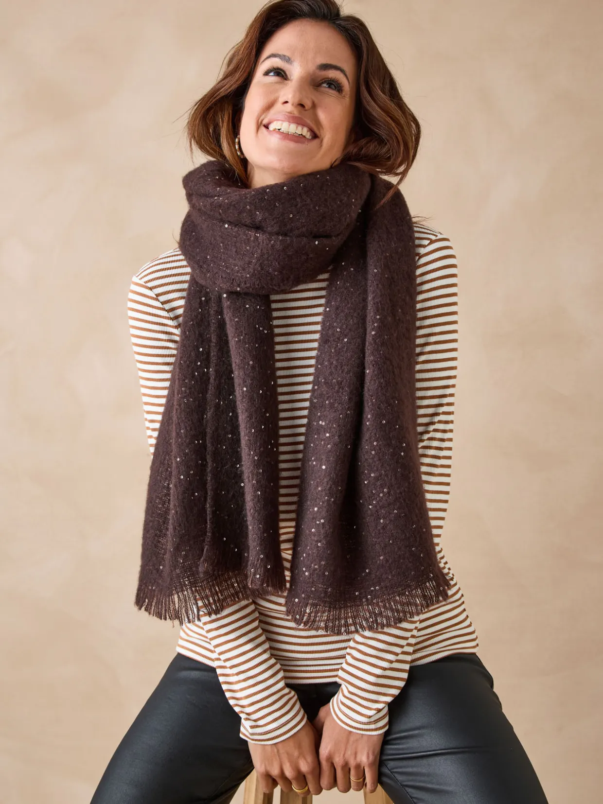 Une maille toute douce incrustée de sequins pour cette étole qui ne manquera pas de donner un coup d’éclat à votre look !