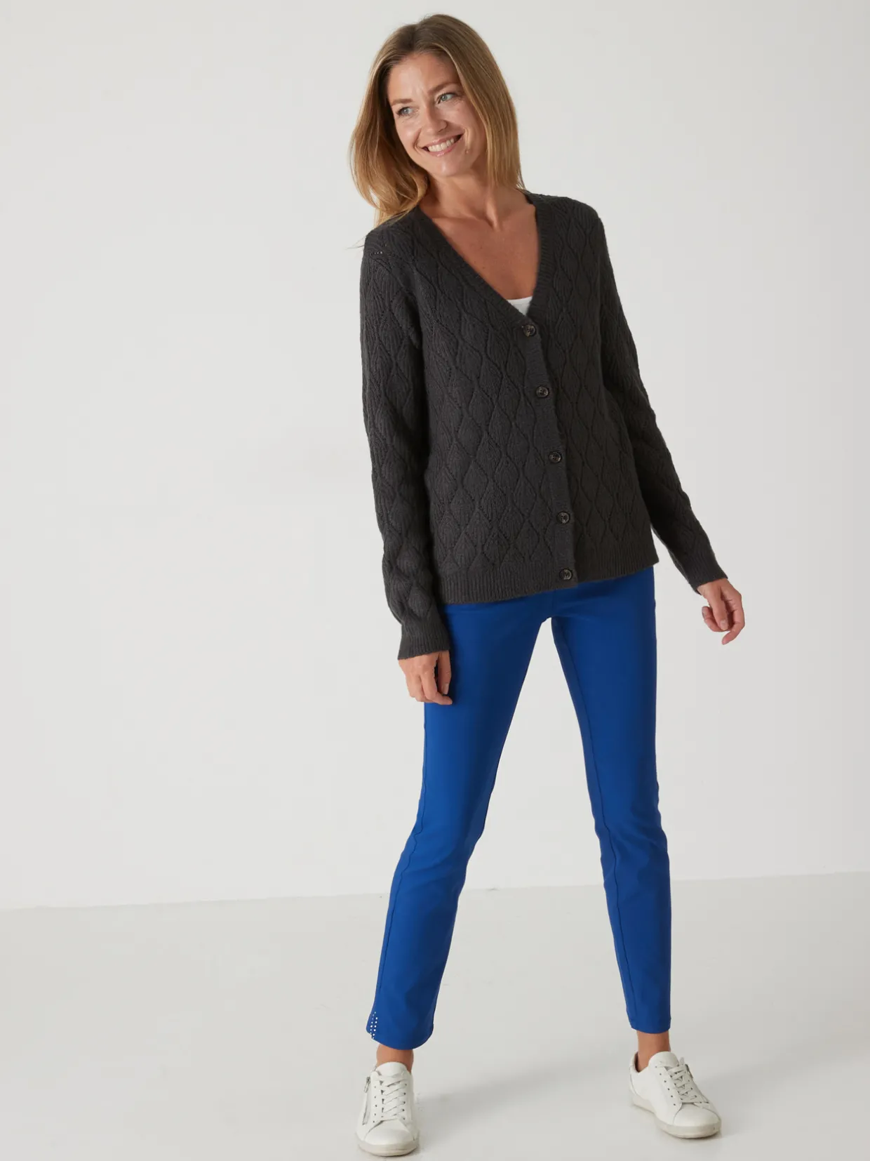 Un point fantaisie donne du caractère à ce gilet V. On n’hésitera pas à le porter pour une sortie, une soirée. A moins que vous ne préfériez l’esprit chic décontracté d’une association avec un jean ?
