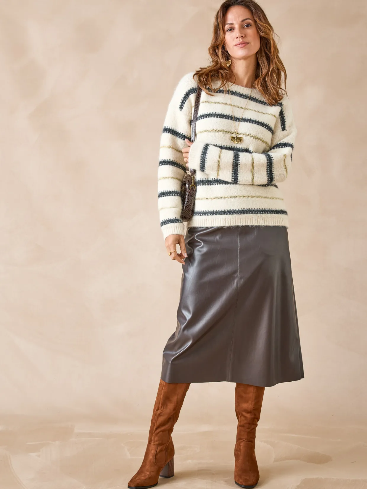 Une imitation cuir qui promet un vrai succès pour cette jupe à panneaux, à la coupe légèrement évasée.