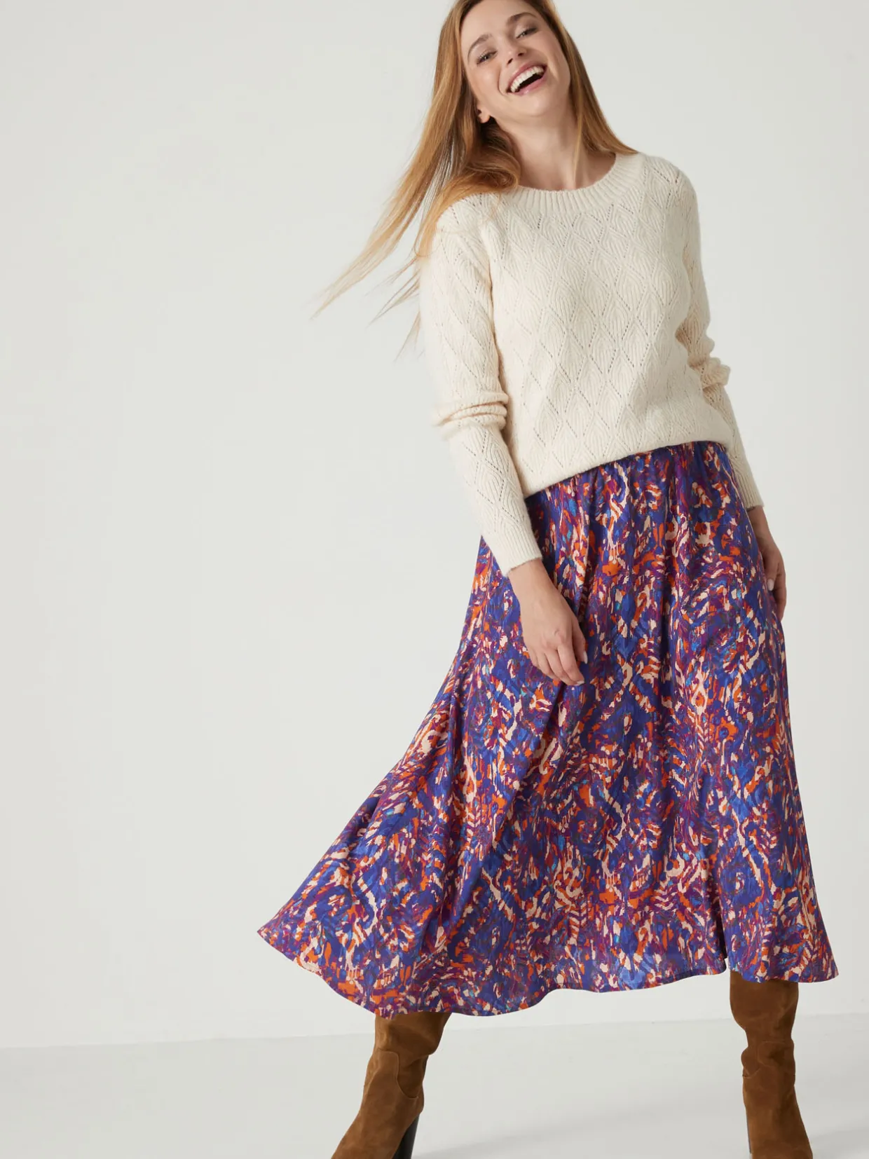 Un joli tissu qui se colore d’un imprimé de saison pour cette jupe longue. Avec une paire de bottes, de boots ou même des baskets blanches, elle a du style !