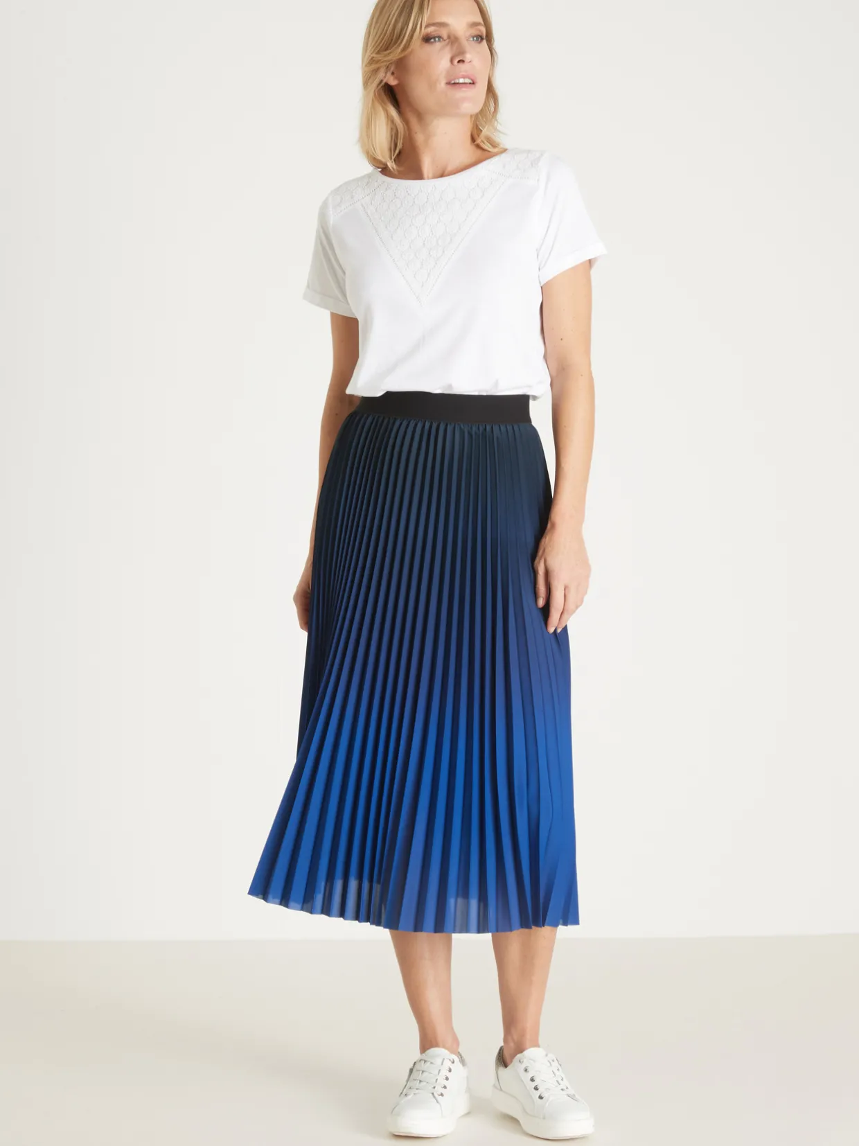 Originalité d’un imprimé aux nuances légèrement dégradées qui revisite avec brio le style de la jupe plissée soleil. Une jupe entièrement élastiquée qui s’adapte en souplesse à la taille.