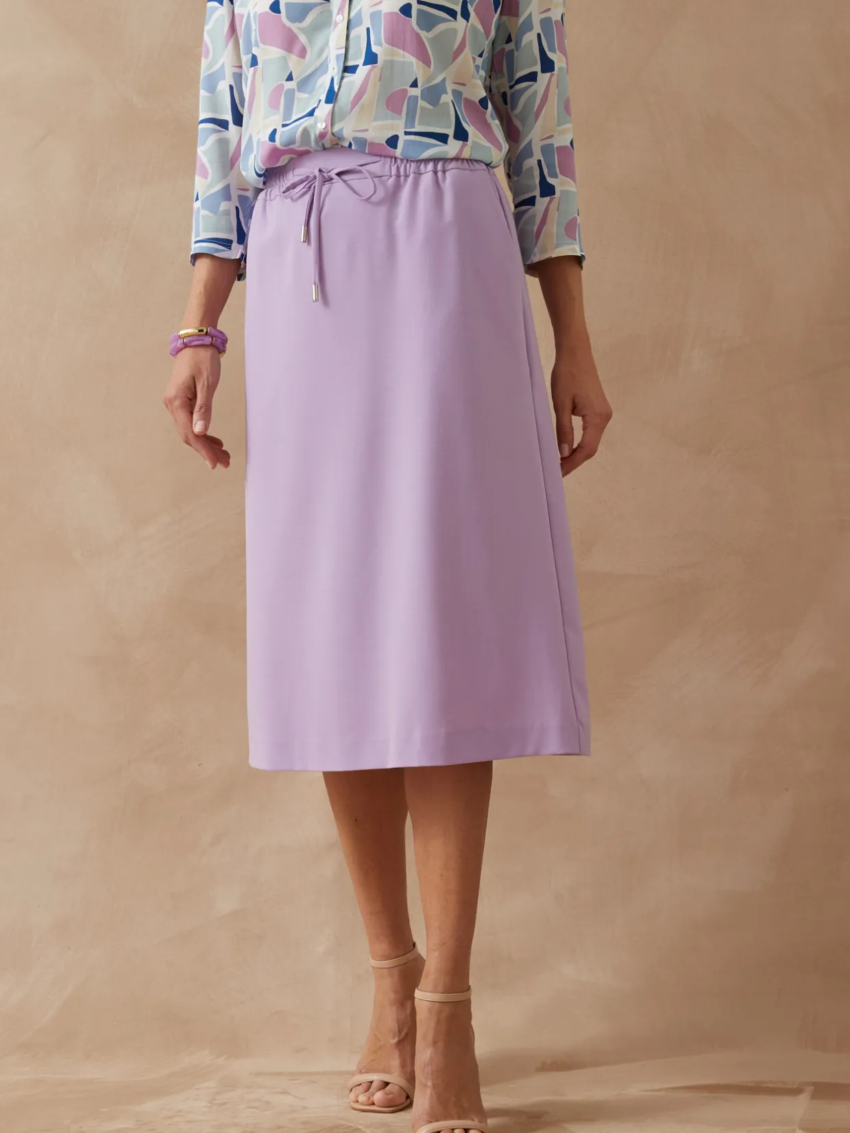 Féminité d’une coupe trapèze, confort d’un tissu enrichi d’un peu d’élasthanne pour la liberté de mouvements et d’une ceinture élastiquée : cette jupe évasée est un bon pion du dressing.