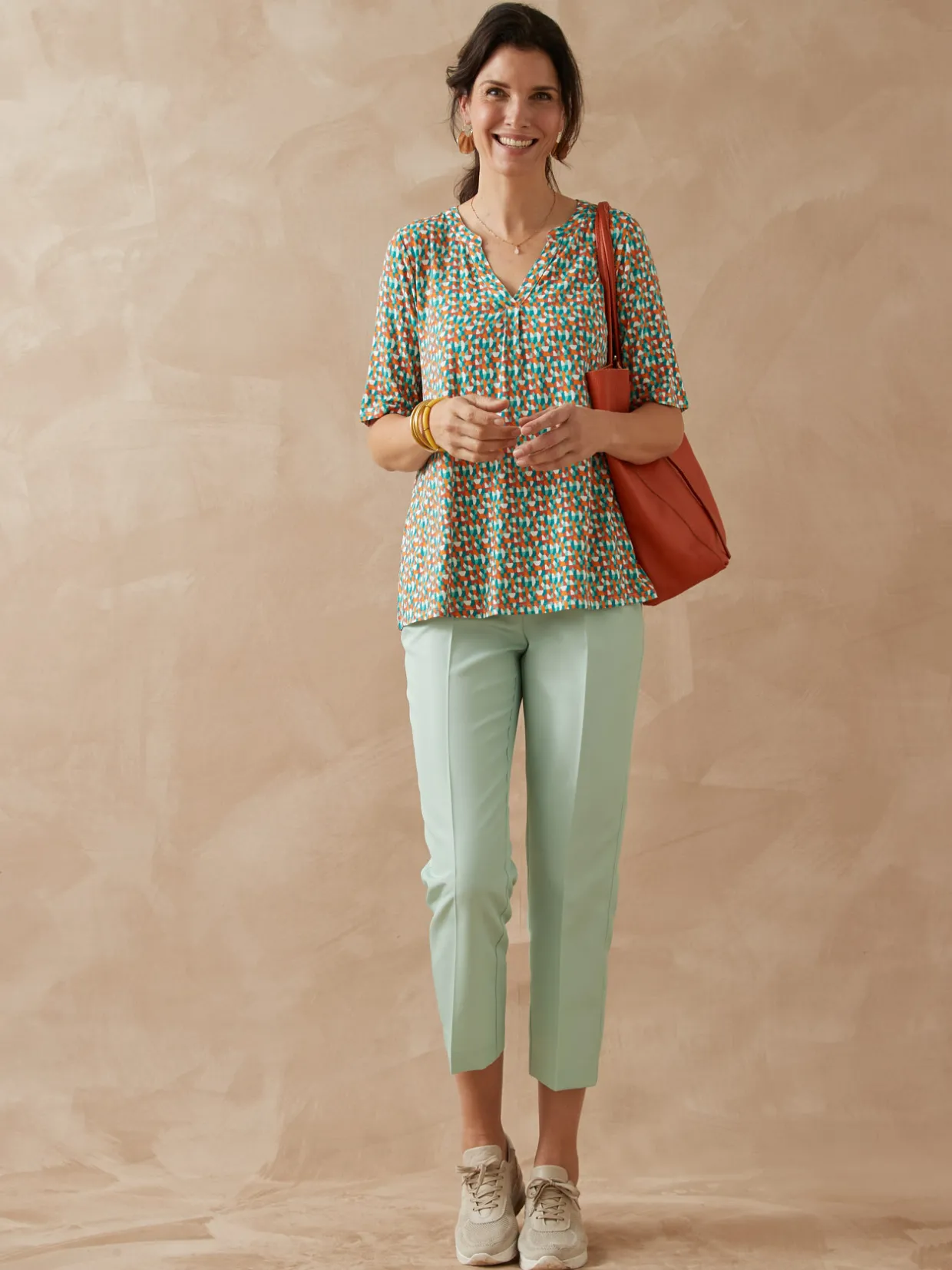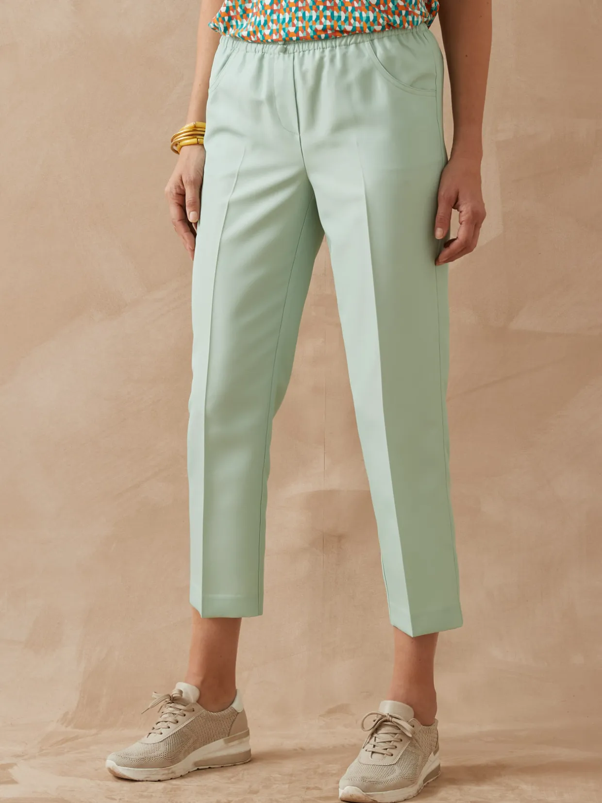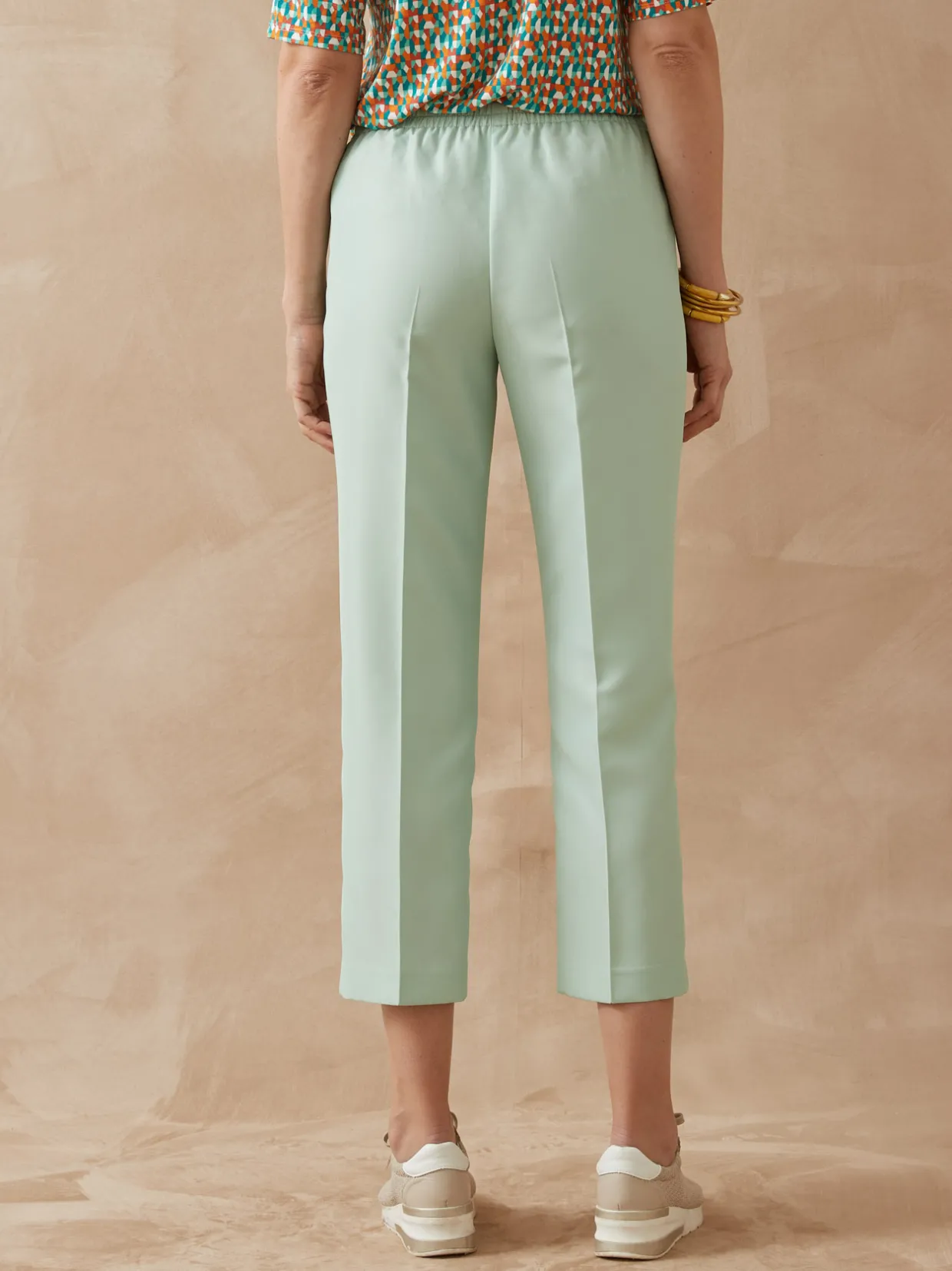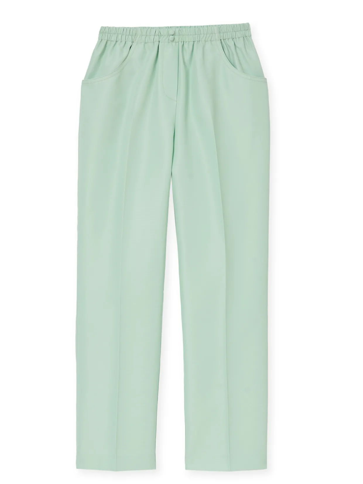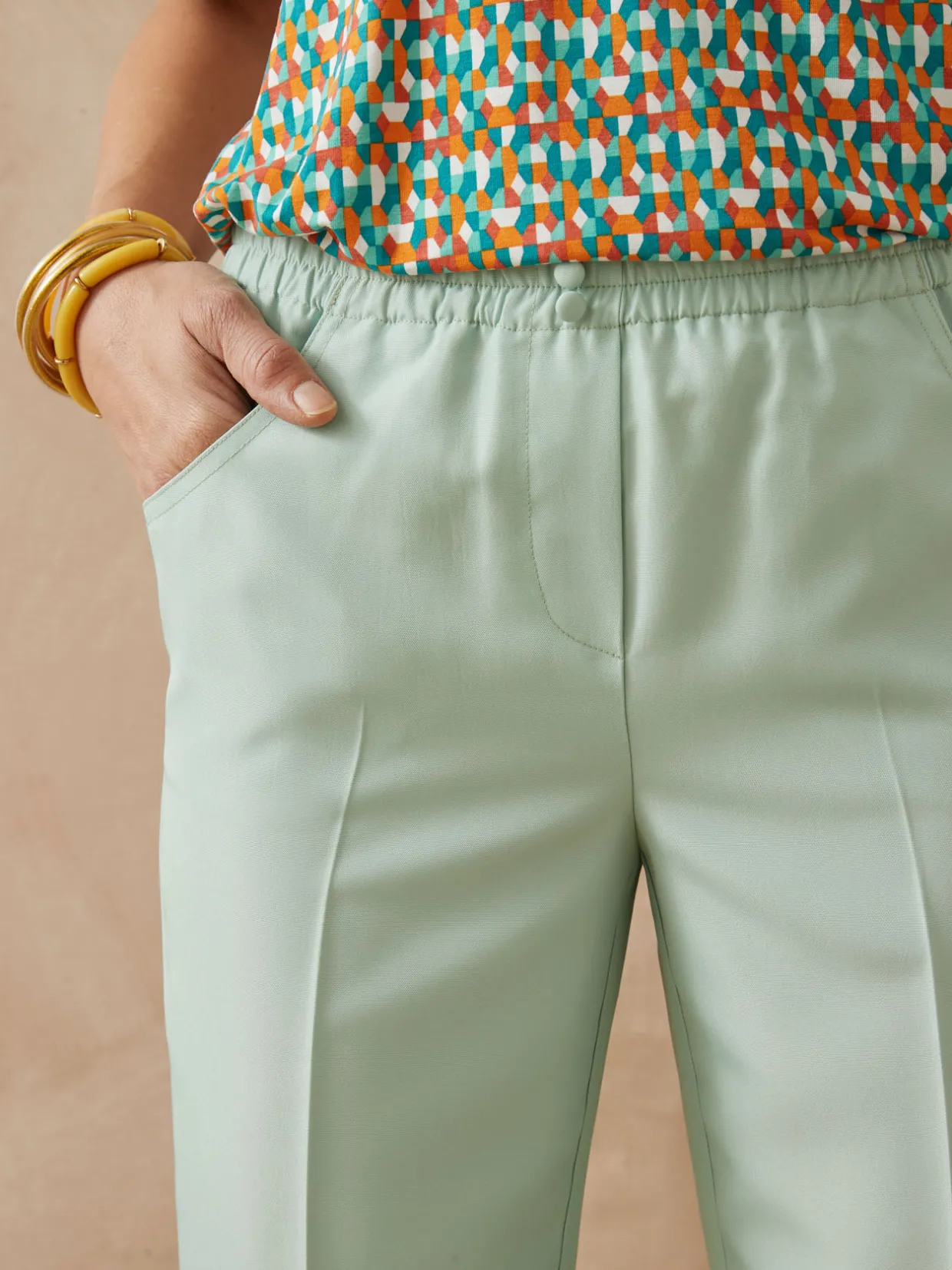 Ceinture entièrement élastiquée, de 2 petits boutons recouverts. 2 poches arrondies. Plis permanents.