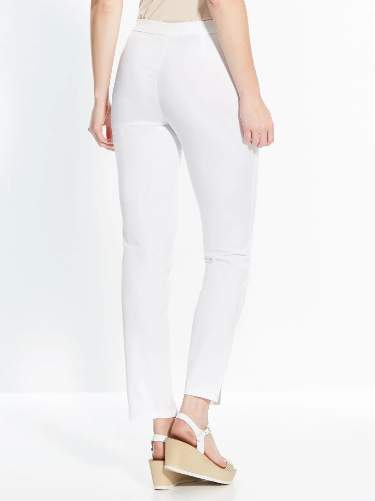 Ceinture entièrement élastiquée (élastique plat invisible), zippée et boutonnée côté. Pinces devant et dos. Bas 16cm, fendus côtés.