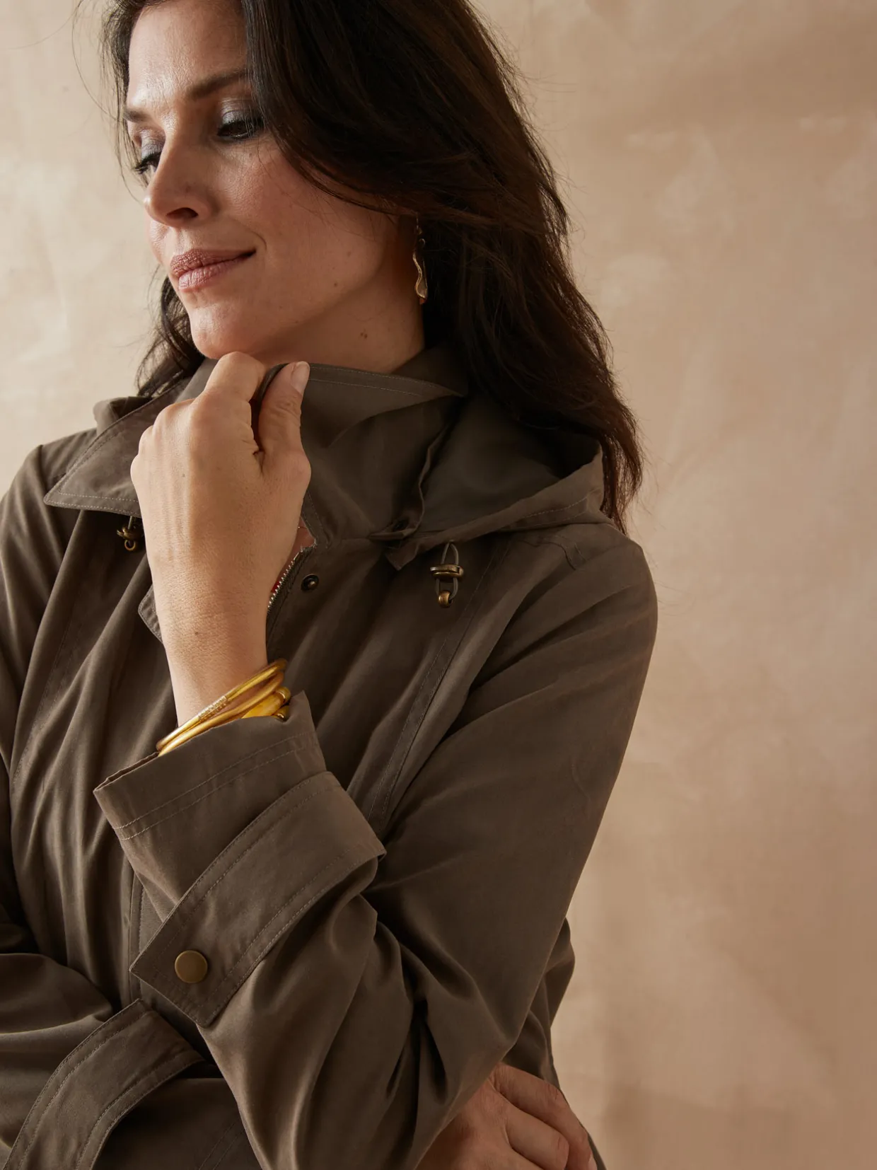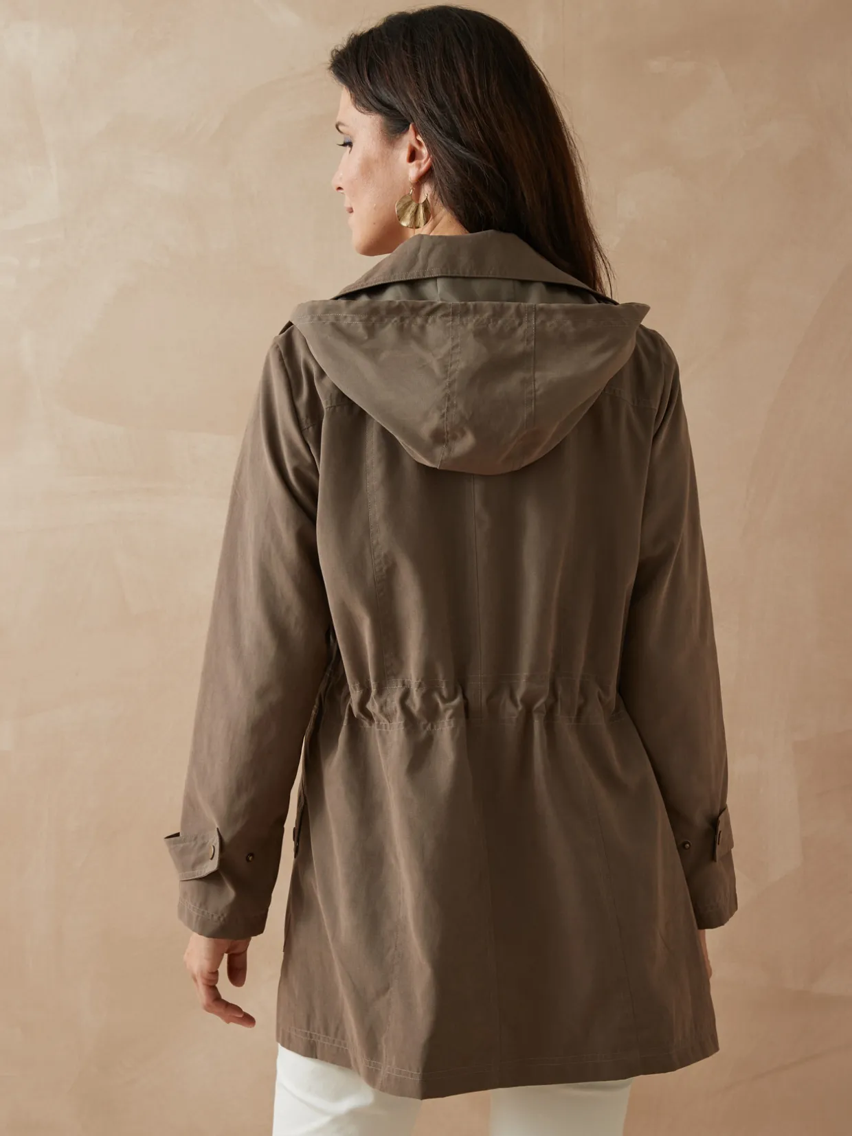 Col légèrement arrondi. Glissière métal sous patte pressionnée. Empiècement épaules et dos. Découpes bretelles devant et dos. Lien de serrage à la taille avec stoppeurs. 2 grandes poches à rabat asymétrique et pressions. Poche intérieure. Patte réglable par pression au bas des manches longues. Capuche amovible par pressions, avec lien et stoppeurs.