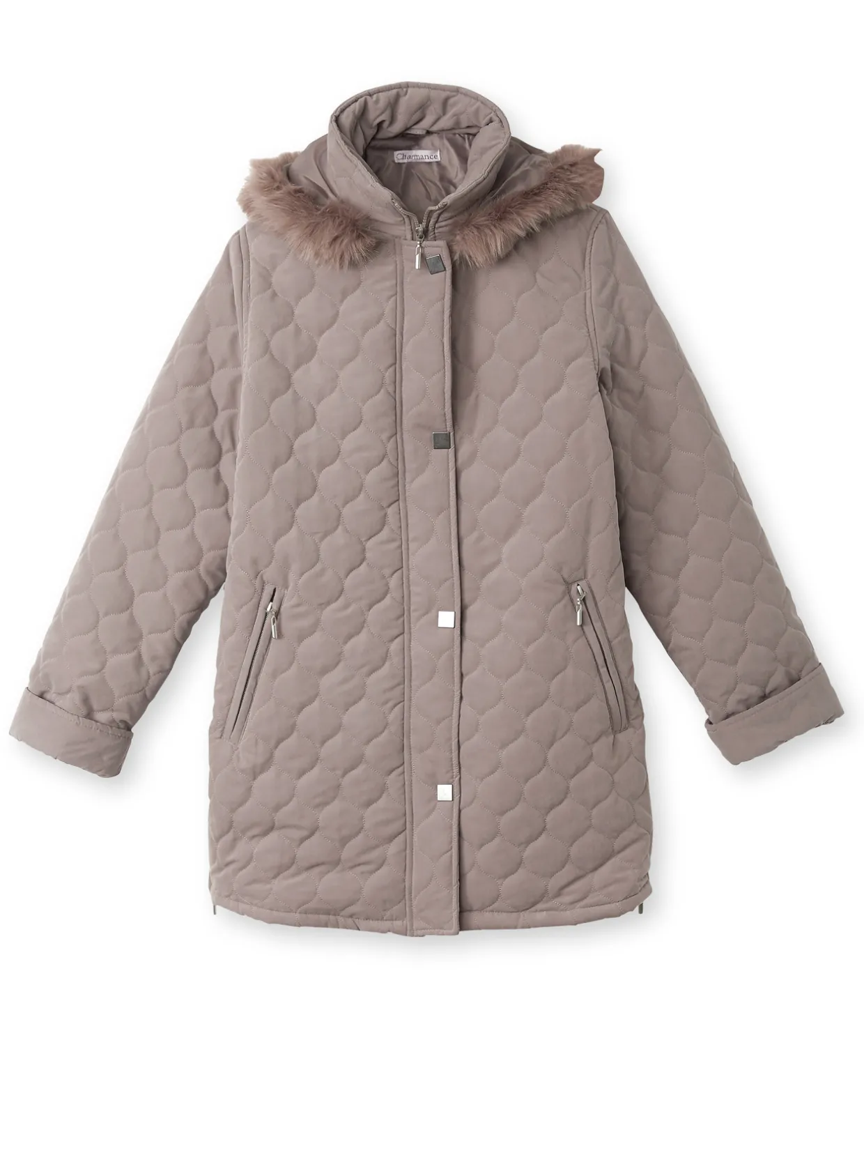 Glissière sous patte pressionnée jusqu’en haut du col. Capuche amovible bordée d’imitation fourrure (66% acrylique, 21% polyester, 13% modacrylique). 2 poches en biais passepoilées zippées. 2 fentes zippées à la base. Manches longues avec revers ajustable.