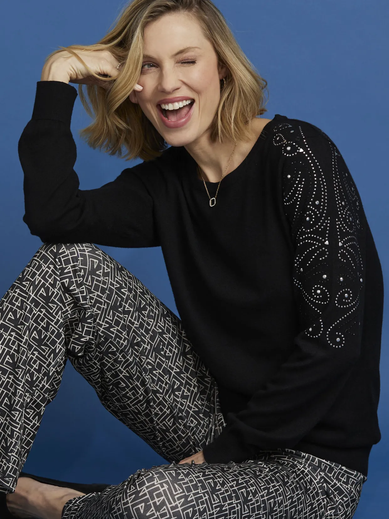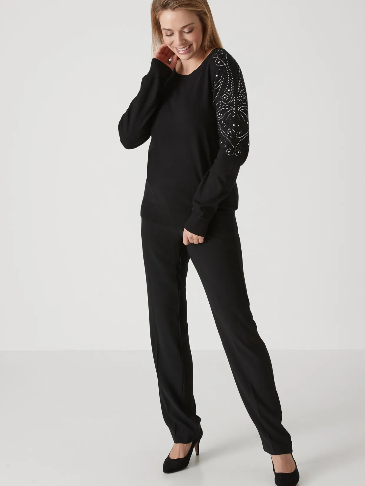 Ce pull avec strass femme est conçu pour s’adapter à toutes les morphologies : petites et grandes tailles.