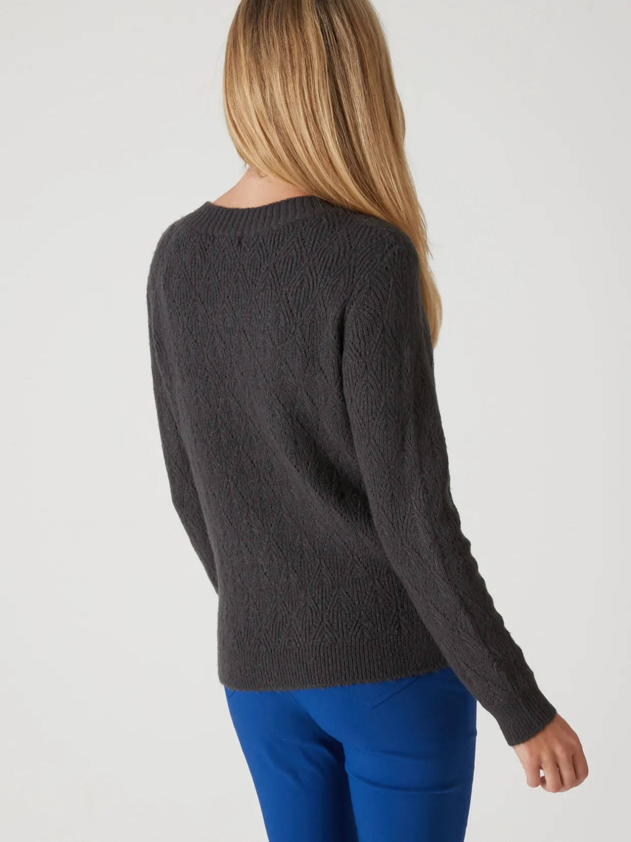 Ce pull en maille fantaisie se distingue par le raffinement de son point pointelle, un tricot ajouré qui apporte une touche de délicatesse à votre tenue.