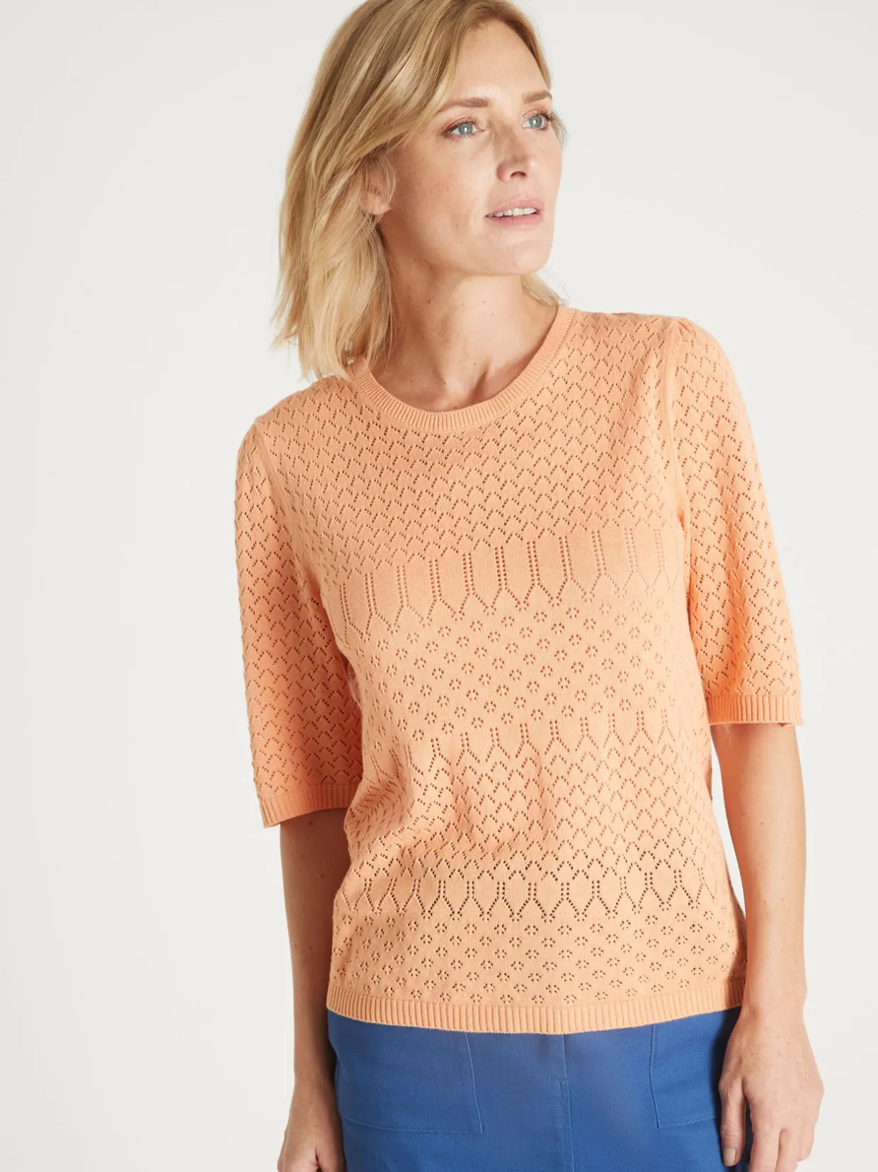 Encolure ronde. Jeu d’ajourés et de points fantaisie. Emmanchures semi-diminuées. Jolies manches au coude froncées. Finitions bords-côtes.