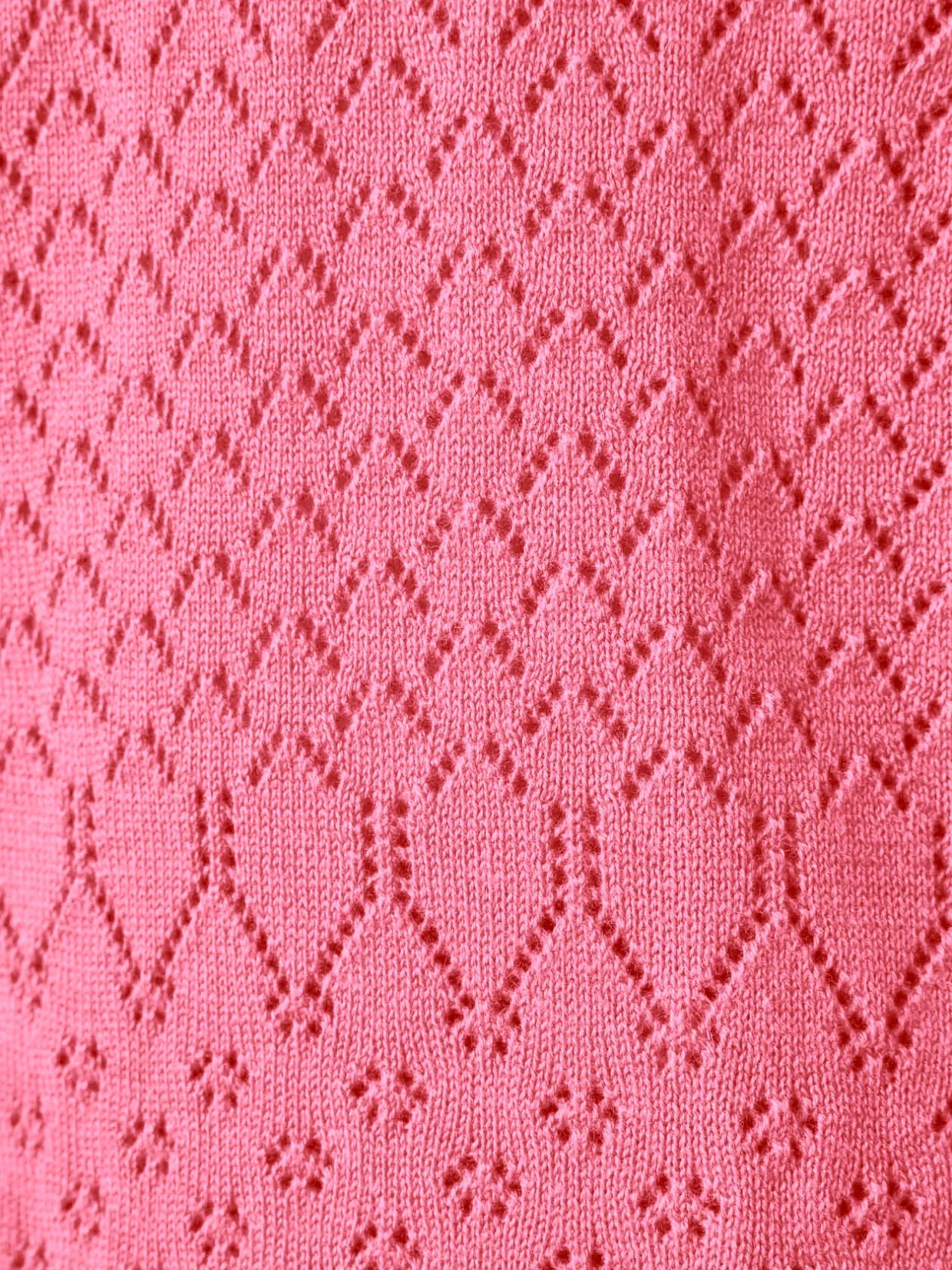 Encolure ronde. Jeu d’ajourés et de points fantaisie. Emmanchures semi-diminuées. Jolies manches au coude froncées. Finitions bords-côtes.