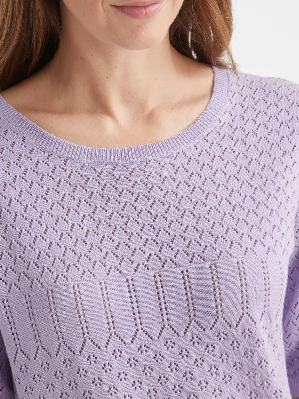 Encolure ronde. Jeu d’ajourés et de points fantaisie. Emmanchures semi-diminuées. Jolies manches au coude froncées. Finitions bords-côtes.