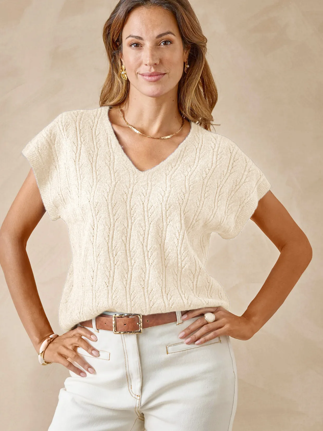 Porté à même la peau ou sur un chemisier, ce pull manches T est, avec ses 5% de laine, un appoint chaleur très sympa.