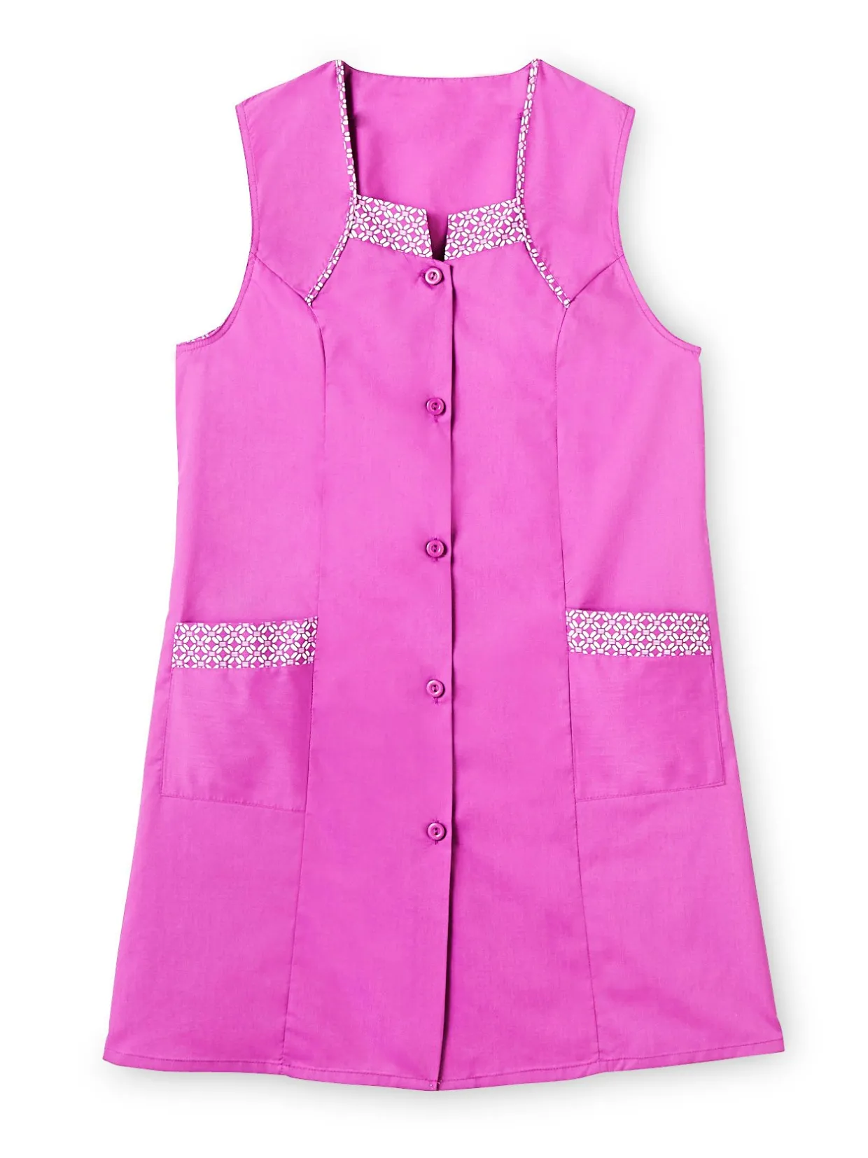 – Encolure et revers des poches contrastants (unis sur tablier imprimé, imprimés sur tablier uni).