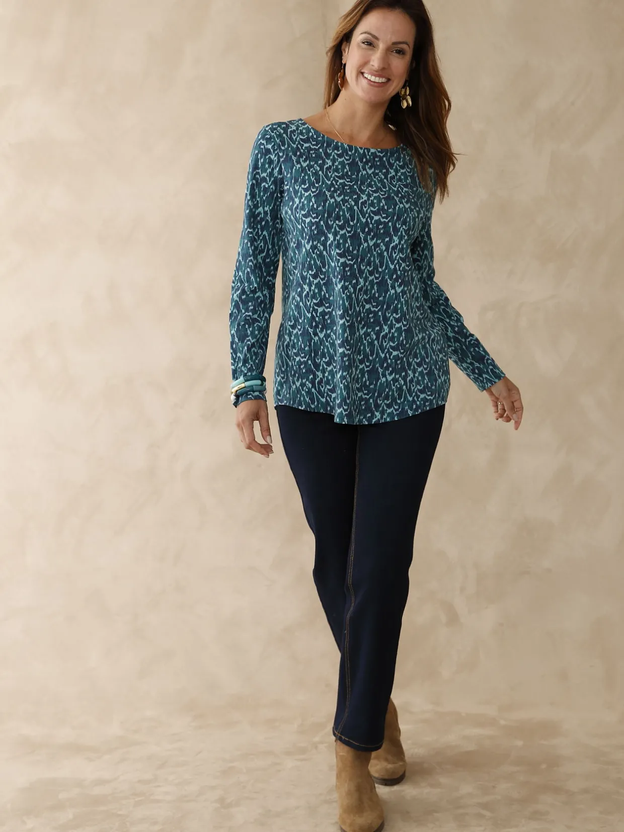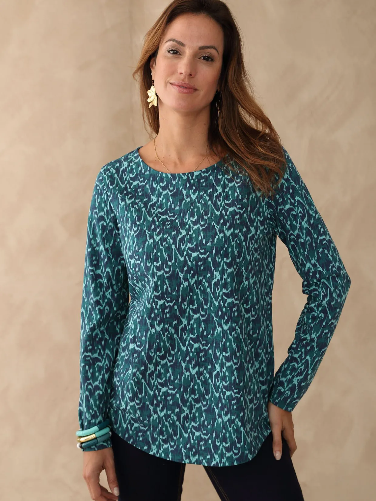 On aime la coupe légèrement évasée et la base arrondie de ce tee-shirt manches longues qui permettent de le porter sur une jupe ou un pantalon, un peu façon tunique. Quant à son imprimé, aux jolies tonalités de bleu, il est juste parfait !