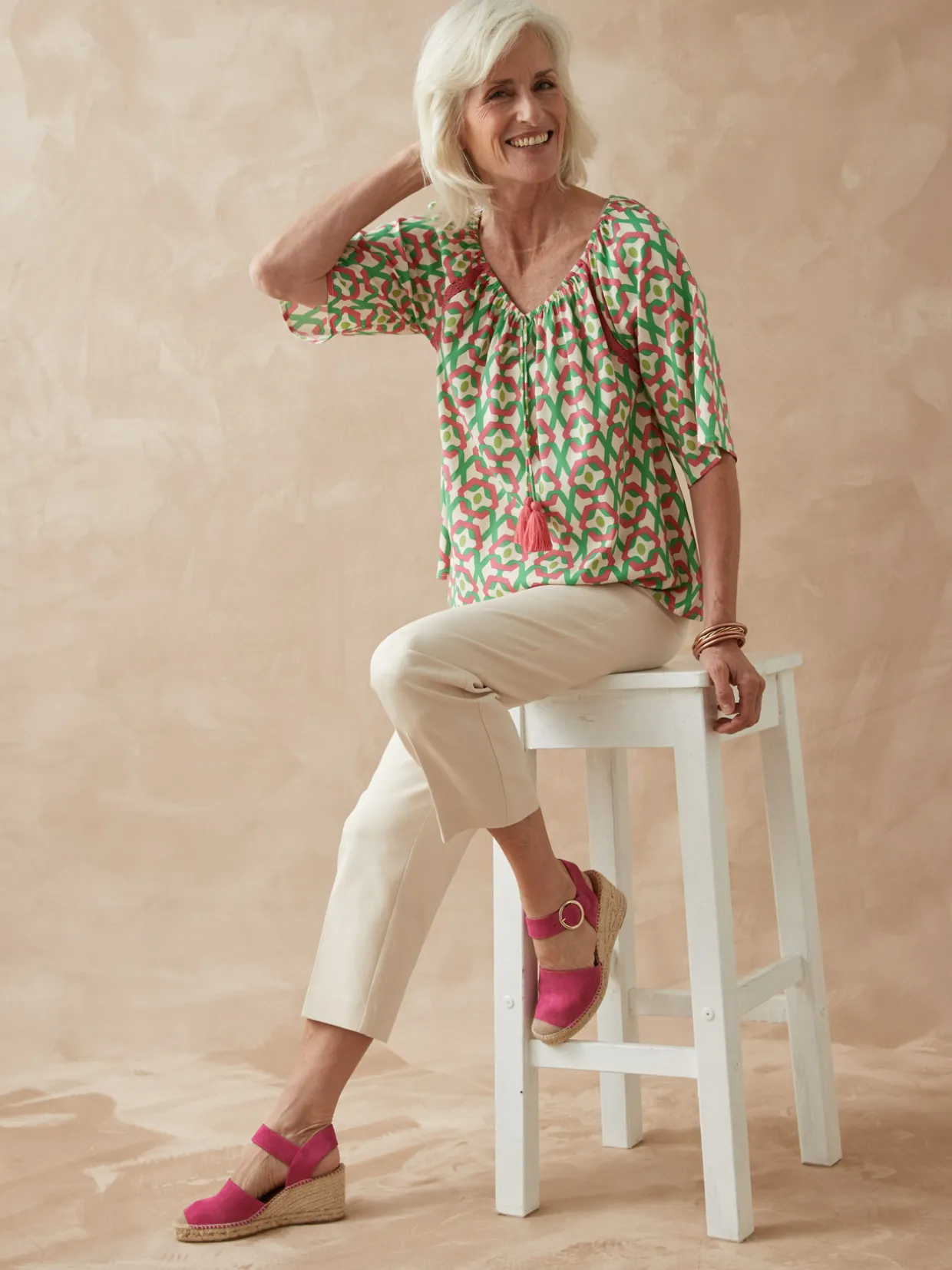 Cette tunique imprimée a choisi un joli galon de dentelle aux emmanchures raglan pour jouer la carte de la fantaisie et du raffinement : effet gagnant ! Grâce à son encolure élastiquée, elle s’enfile facilement.
