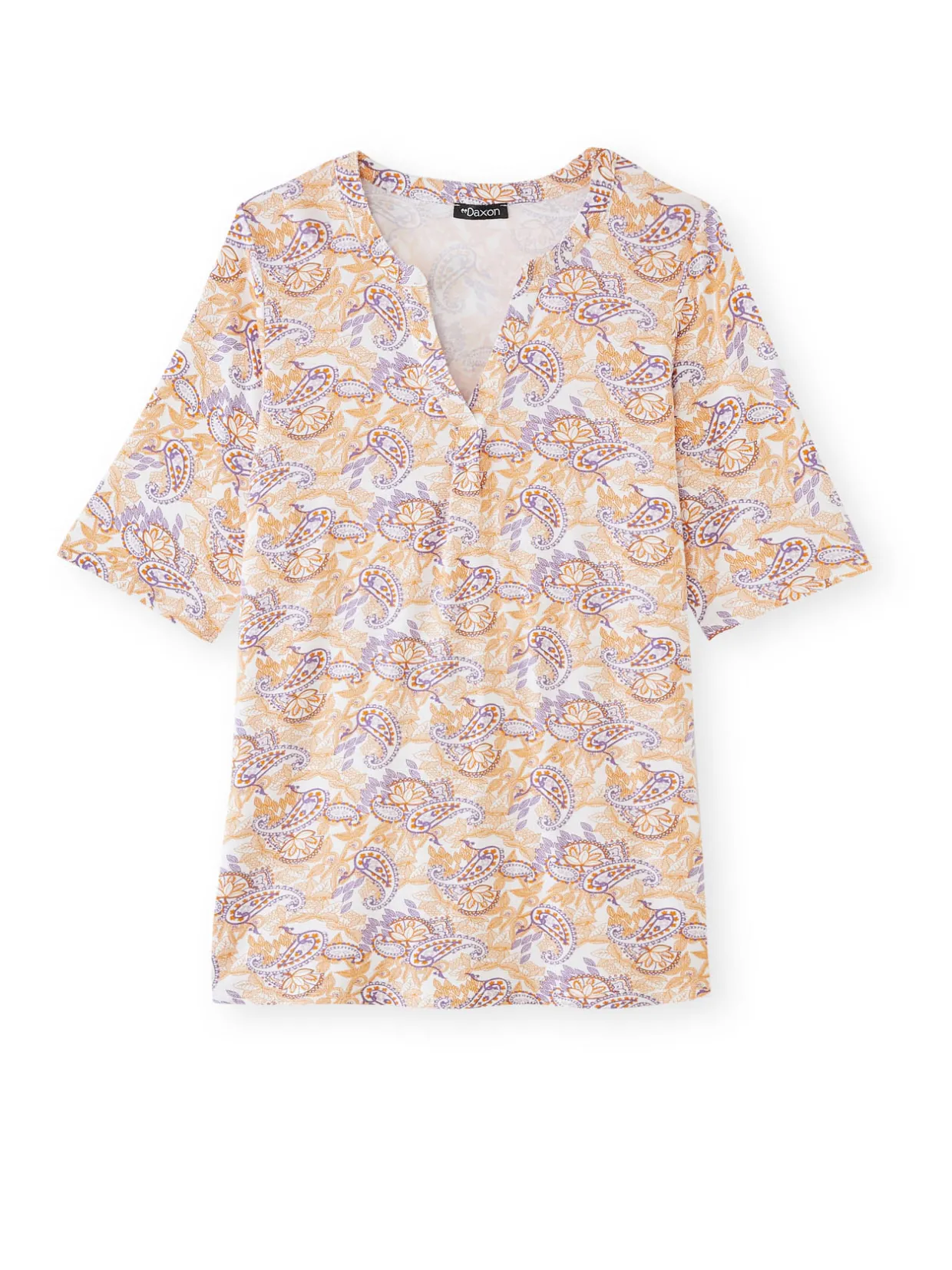 Tunique imprimée en maille extensible 95% viscose, 5% élasthanne.