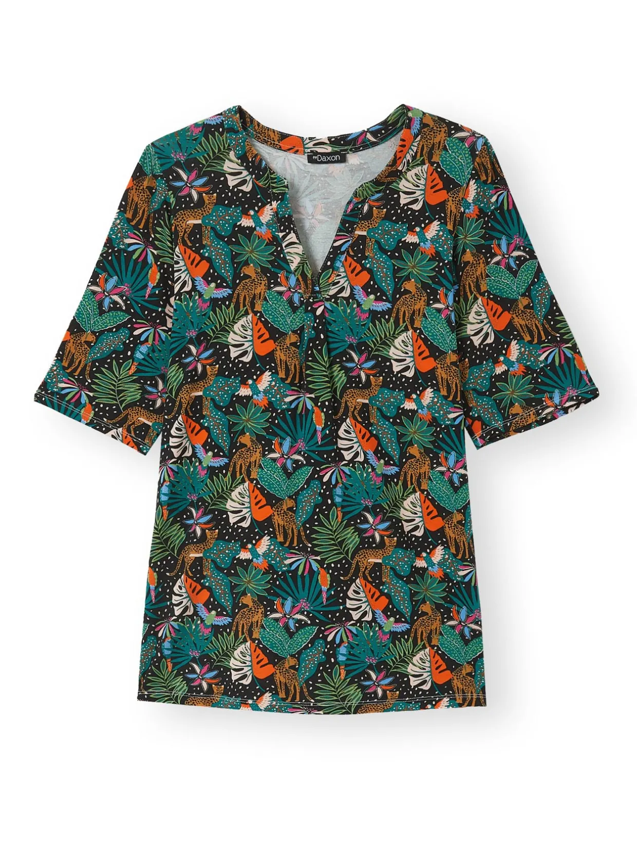 Tunique imprimée en maille extensible 95% viscose, 5% élasthanne.