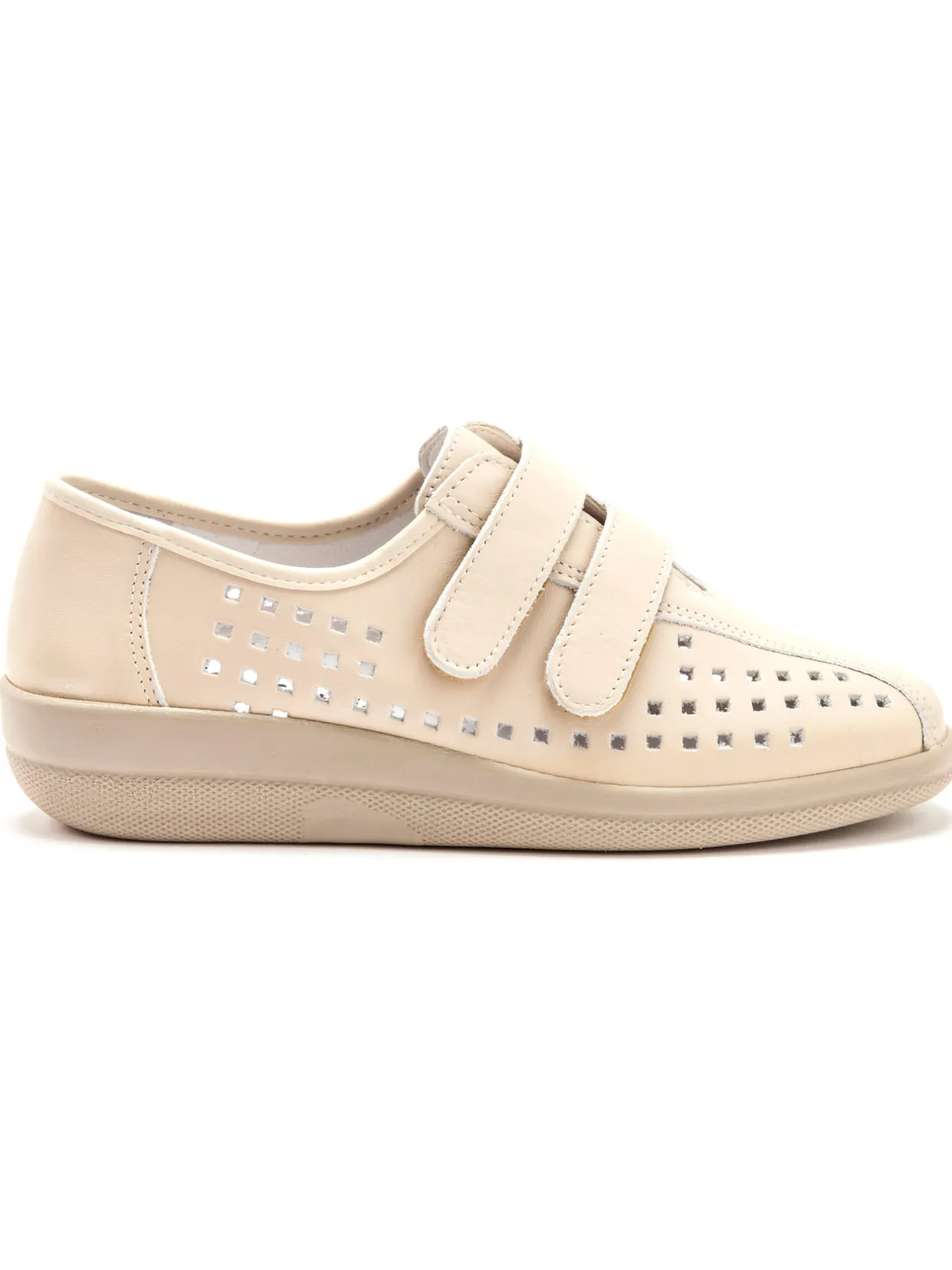 Dessus : cuir pleine fleur avec perforations fantaisie. Fermeture par double patte auto-agrippante (large ouverture et ajustement sur mesure au cou-de-pied). Doublure : synthétique. Semelle intérieure : cuir sur mousse, amovible pour y glisser notre propre semelle. Semelle : polyuréthane ultra légère.