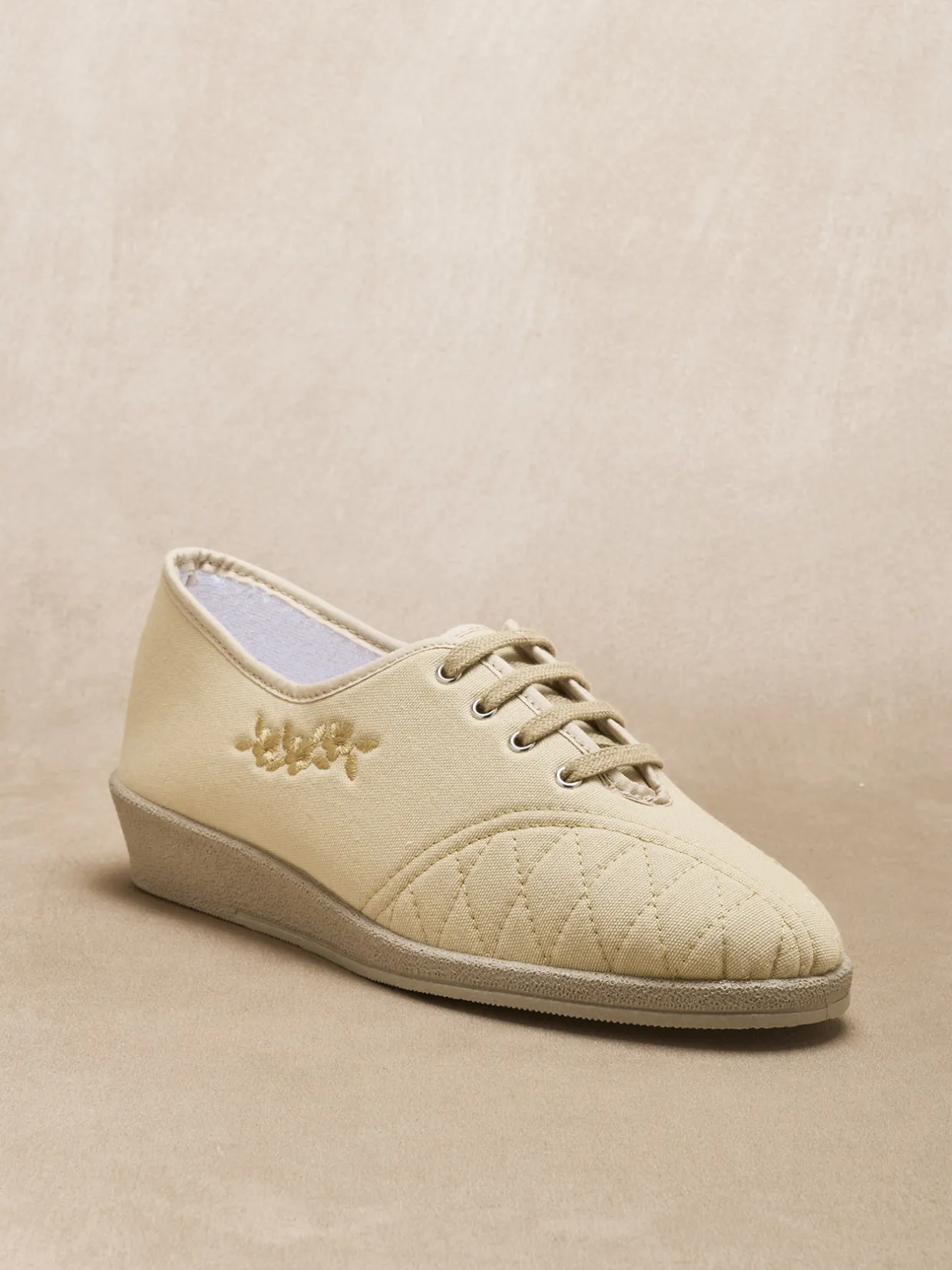 Dessus : toile pur coton. Broderie, bel effet de matelassage apporté par des surpiqûres contrastantes de chaque côté de l’empeigne, finition biais ton sur ton. Doublure et semelle intérieure : éponge sur mousse. Semelle : élastomère compensée.