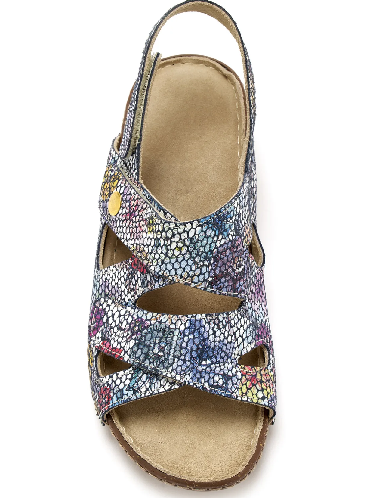 Extra larges, ces sandales à scratch apportent plus de volume intérieur pour les pieds les plus sensibles qui ne sont plus soumis aux compressions douloureuses