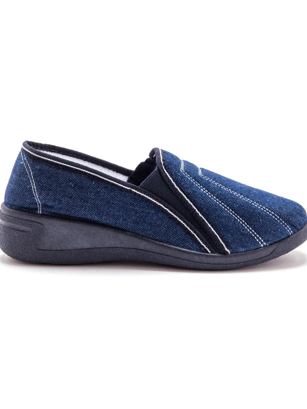 Dessus agrémenté de surpiqûres contrastantes, en textile entièrement monté sur mousse. Doublure et semelle intérieure : éponge. Elastiques côtés pour l’aisance du cou-de-pied. Finition biais fantaisie. Semelle semi-compensée : élastomère.