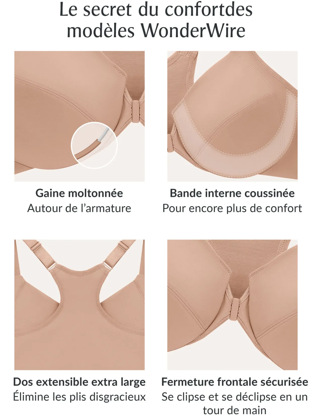 Ce soutien-gorge Wonderwire Glamorise à fermeture frontale bénéficie d’un design unique dans le dos qui affine la silhouette et permet aux vêtements de tomber parfaitement, sans sacrifier le confort. L’armature est dissimulée dans la conception novatrice Wonderwire.