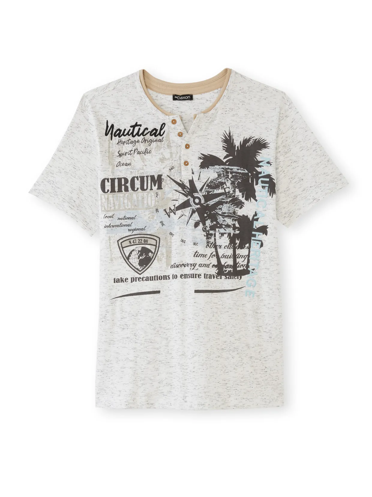 Embarquement immédiat pour l’été avec ce tee-shirt chiné imprimé nautique, à détails brodés ! Son encolure tunisienne joue l’effet de superposition : la petite supplémentaire d’originalité qui nous fait craquer.