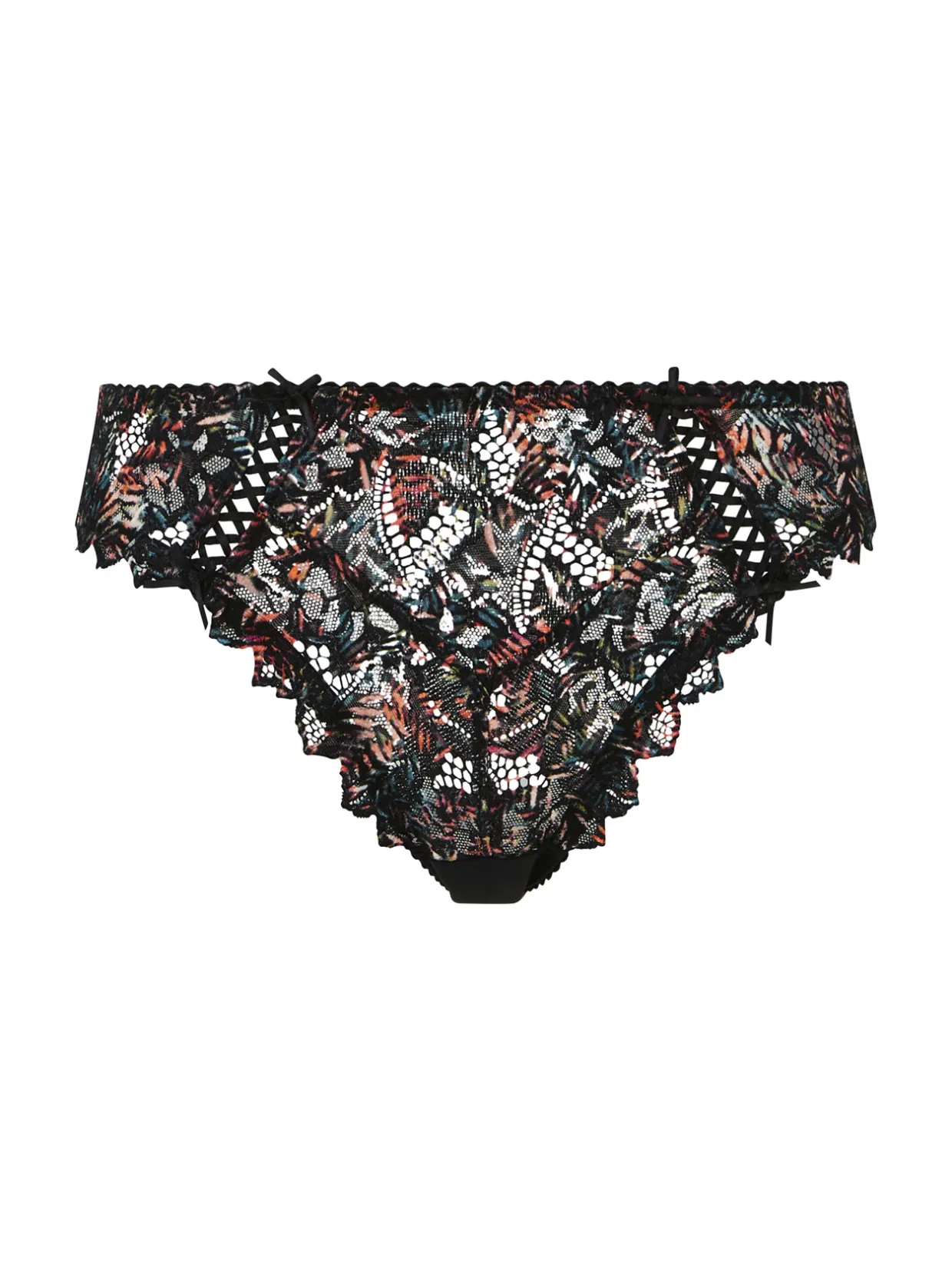 – L’avant du slip est en dentelle extensible imprimée aux motifs floraux ou bien graphiques, l’arrière est fait dans une douce microfibre pour plus de confort