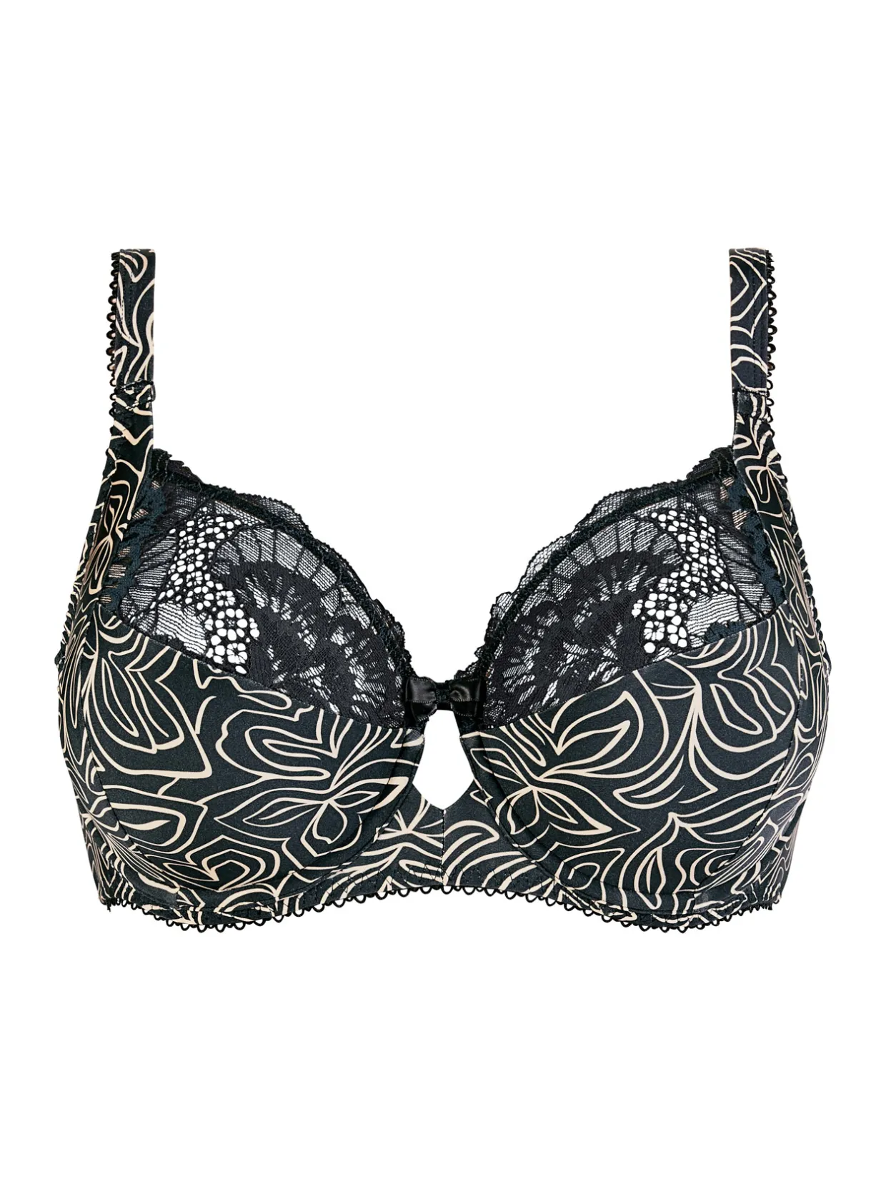 Ce soutien-gorge à la construction 3 tranches conjugue parfaitement maintien et fantaisie, grâce à ses bonnets recouverts de microfibre au motif graphique. Doublés de tulle de maintien avec des finitions en fourreau et une délicate dentelle ils subliment parfaitement le décolleté. L’arrière en U et les côtés doublés de tulle, assurent un confort et un maintien optimal. Le séparateur est ajouré, et nous avons ajouté un petit noeud et des picots à la basque pour plus de fantaisie.