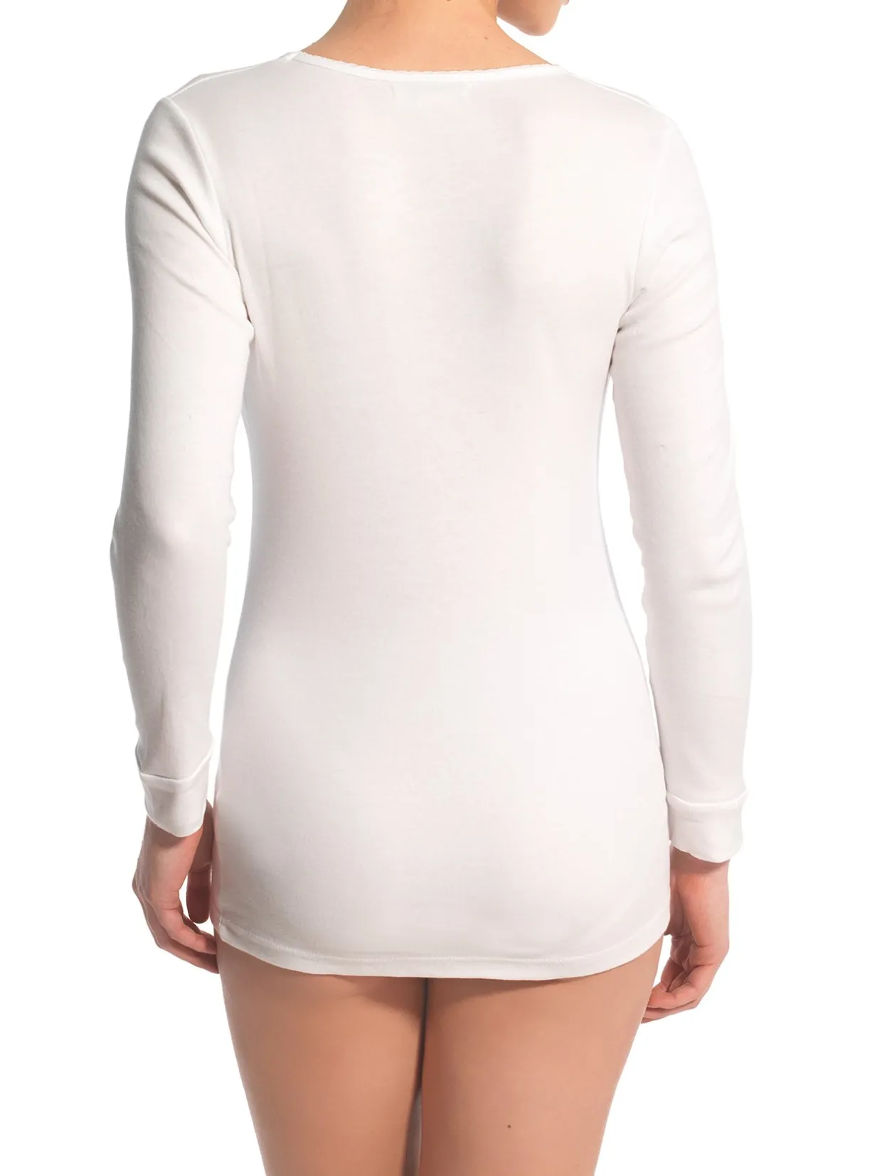 Coupe longue et bien couvrante. Finition picot à l’encolure et bord-côtes au bas des manches longues. Base ourlée.