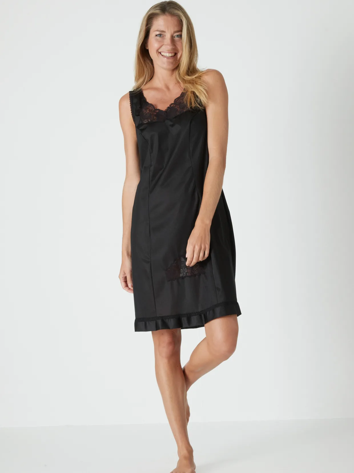 Délicates incrustations de dentelle au décolleté et en rappel devant. Fine dentelle au dos et aux emmanchures. Découpes princesse flatteuses pour la silhouette. Jour échelle à la base ourlée (qui n’accroche pas les collants).