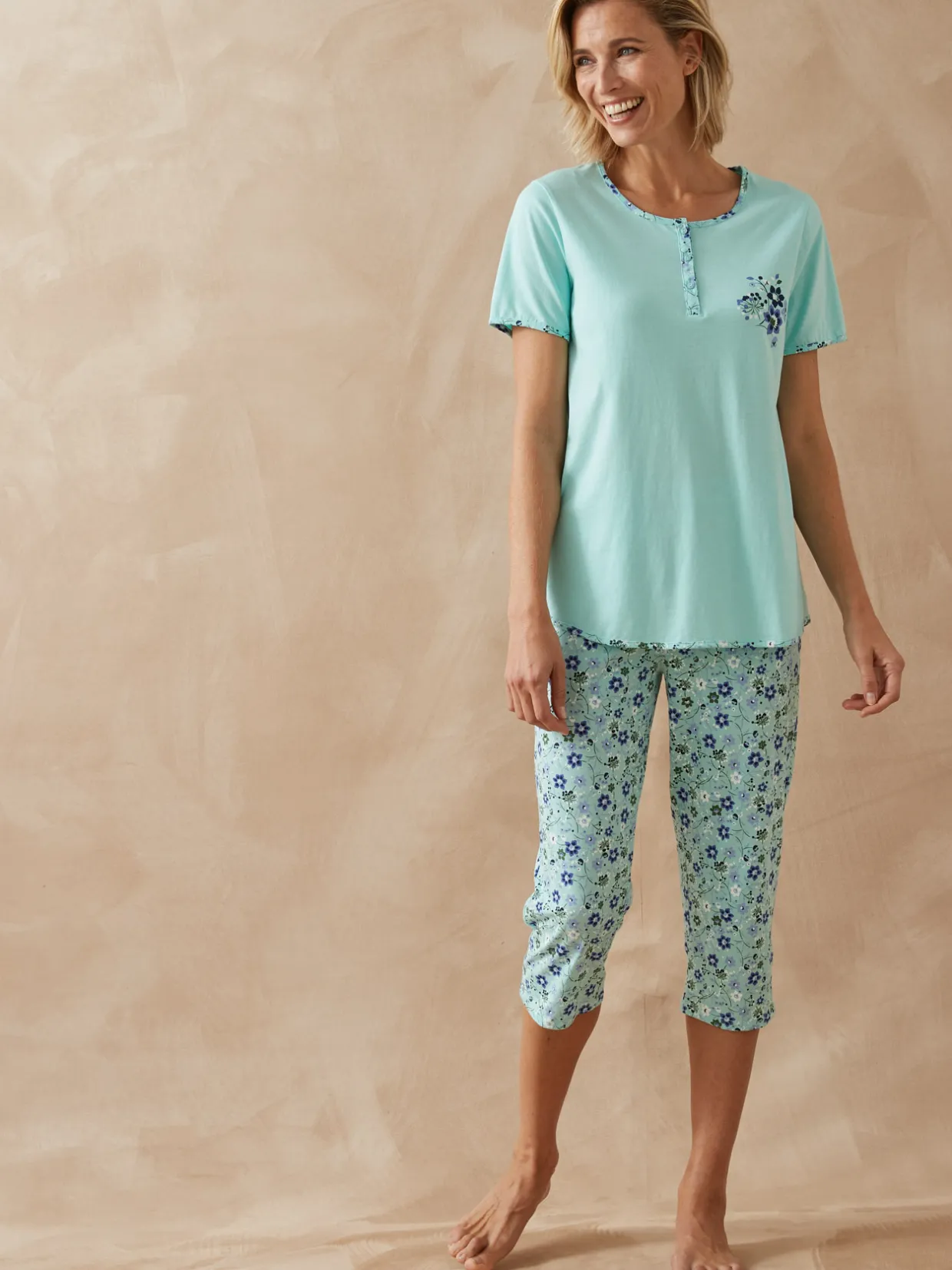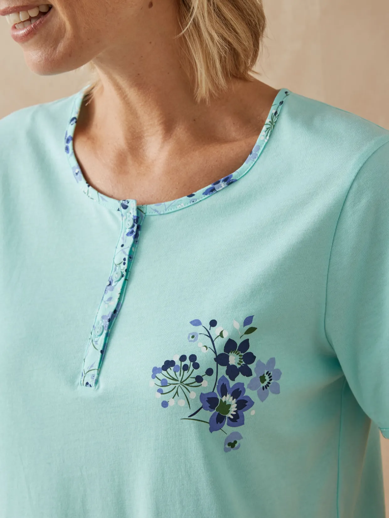 Un pyjacourt sous le signe de la douceur grâce à une maille jersey tout coton et un imprimé vert d’eau très frais. Une pièce phare de votre lingerie de nuit estivale !