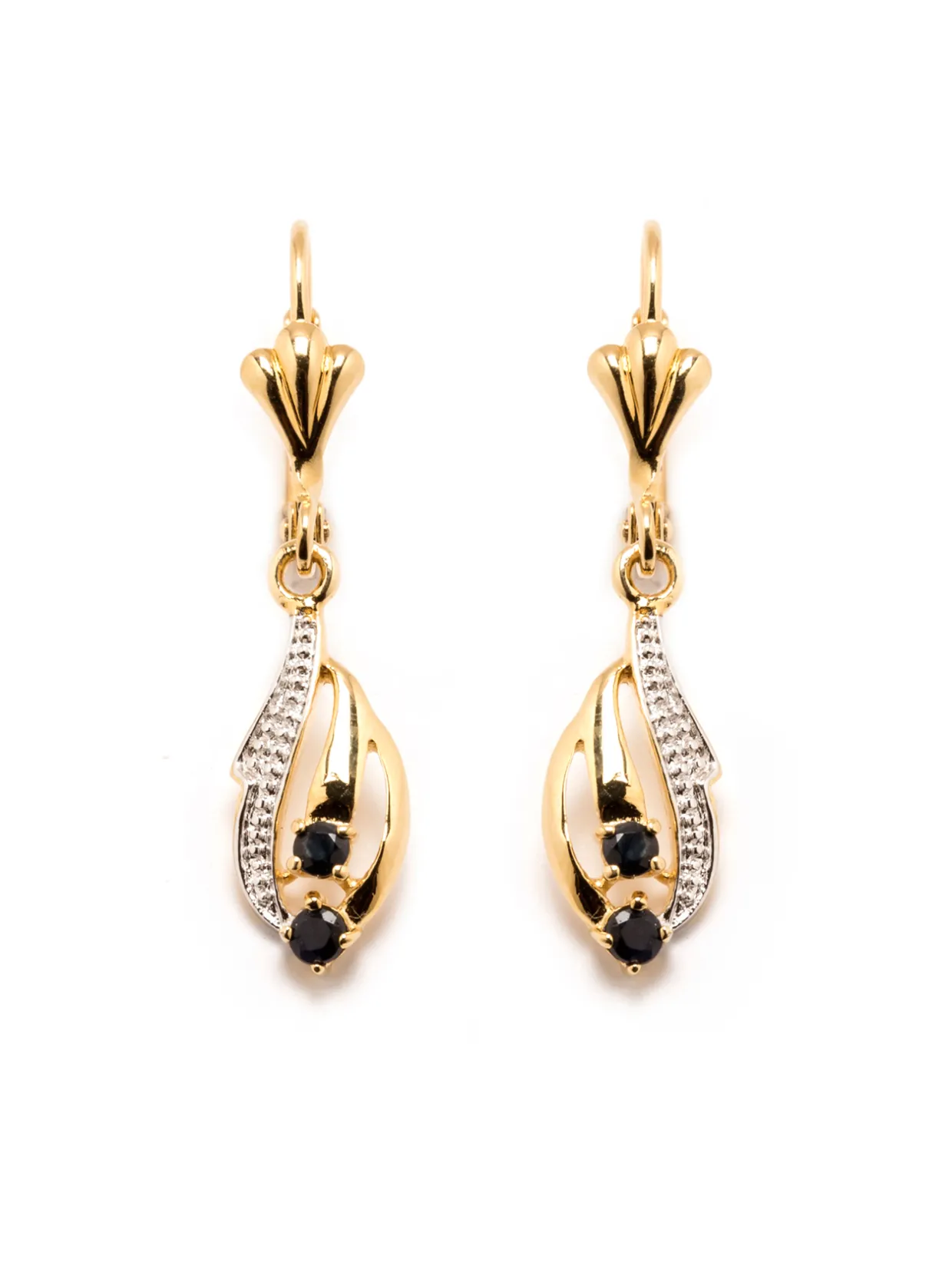Boucles d’oreilles plaqué or 2 tons avec saphirs véritables. Longueur 3,5 cm. L’appellation plaqué or est réservée aux bijoux dont le revêtement d’or est égal ou supérieur à l’épaisseur de 3 microns d’or 750/1000e.