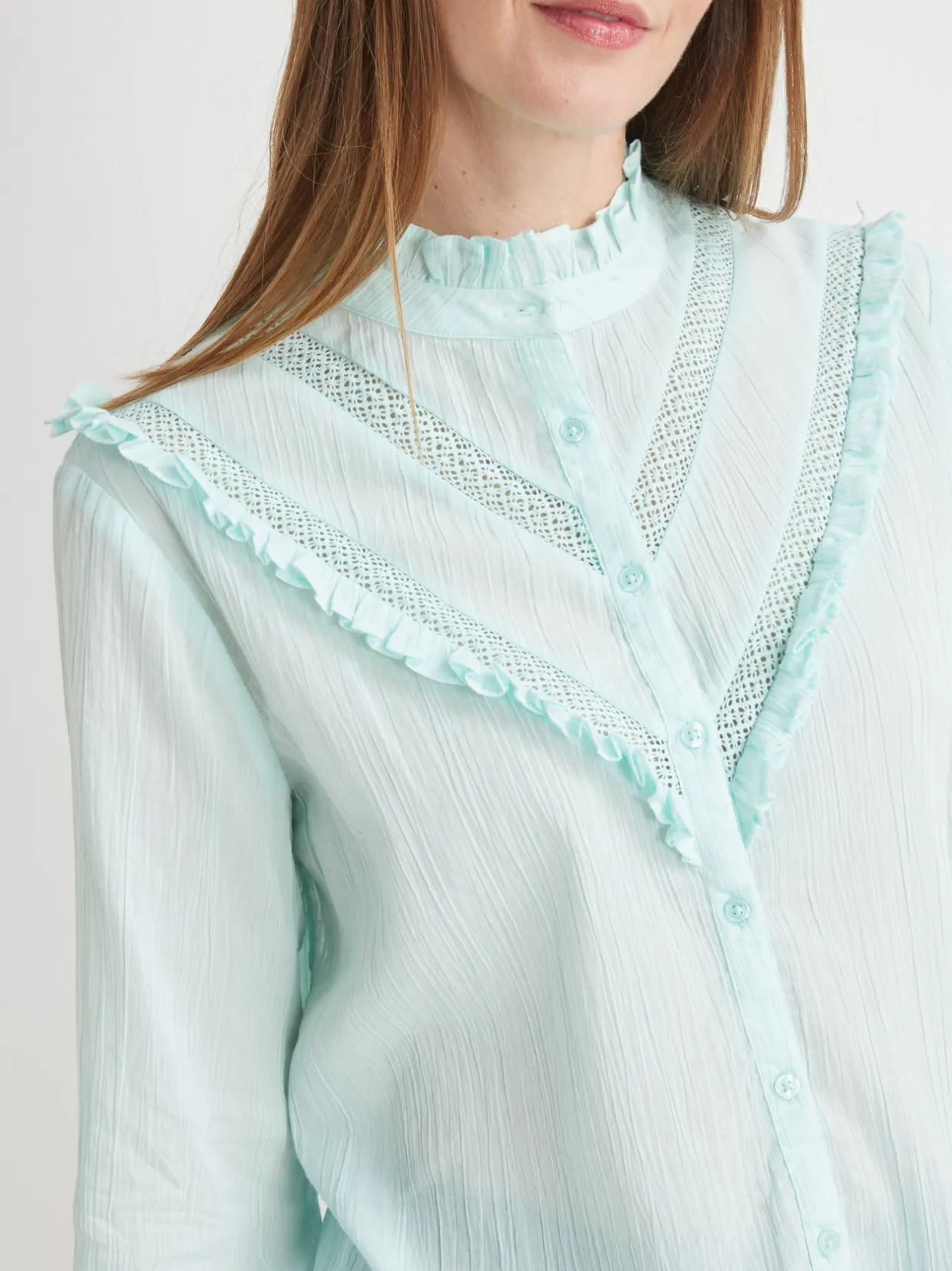 Chic, le chemisier joue les romantiques avec son col montant volanté, son double empiècement devant en pointe (simple au dos), avec galon macramé et petit volant.