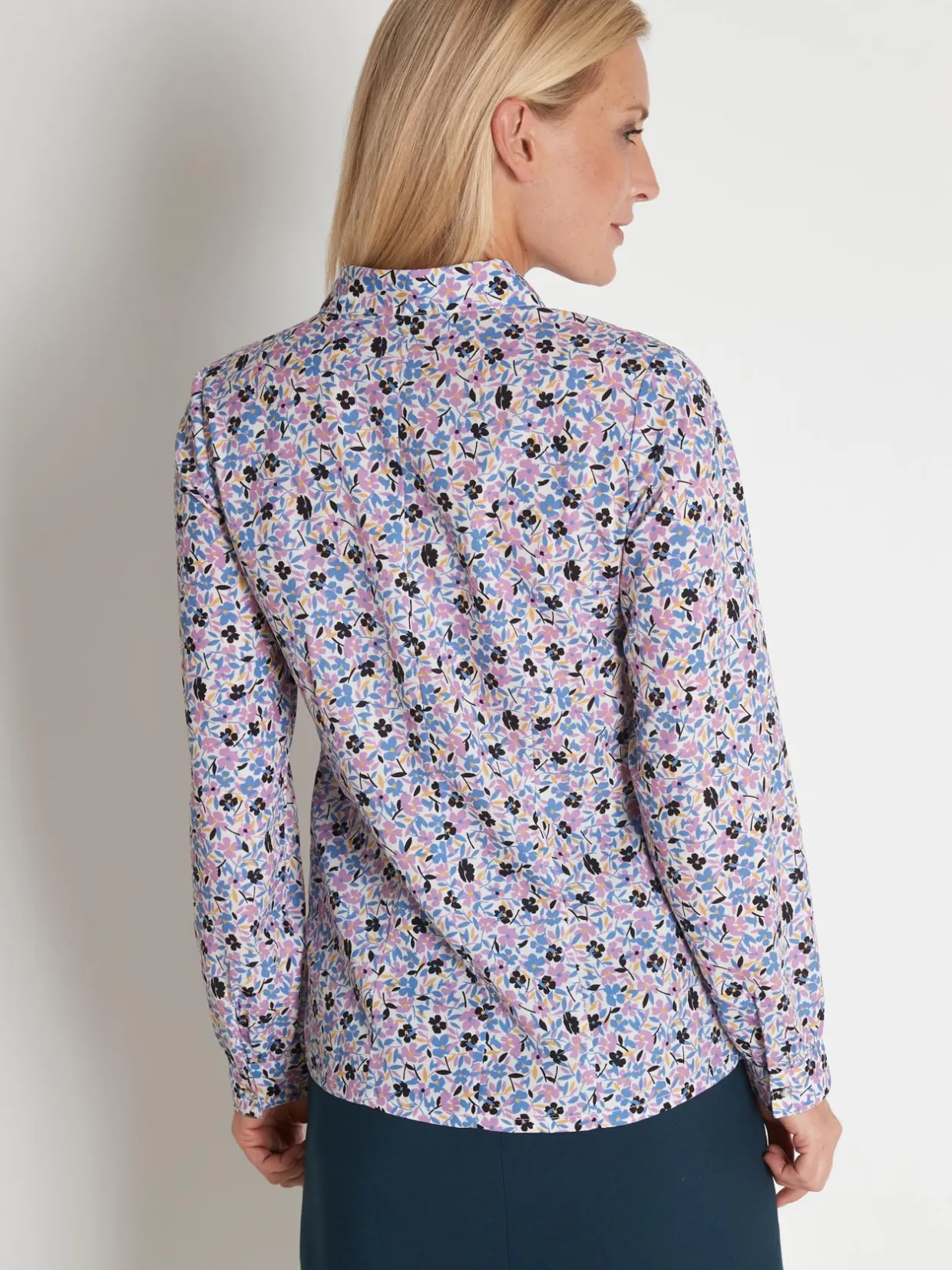 Col pointu sur pied de col. Empiècements épaules et découpes princesse devant. Pinces dos. Manches longues boutonnées avec fronces.