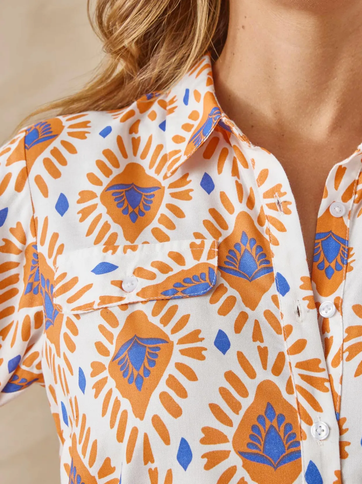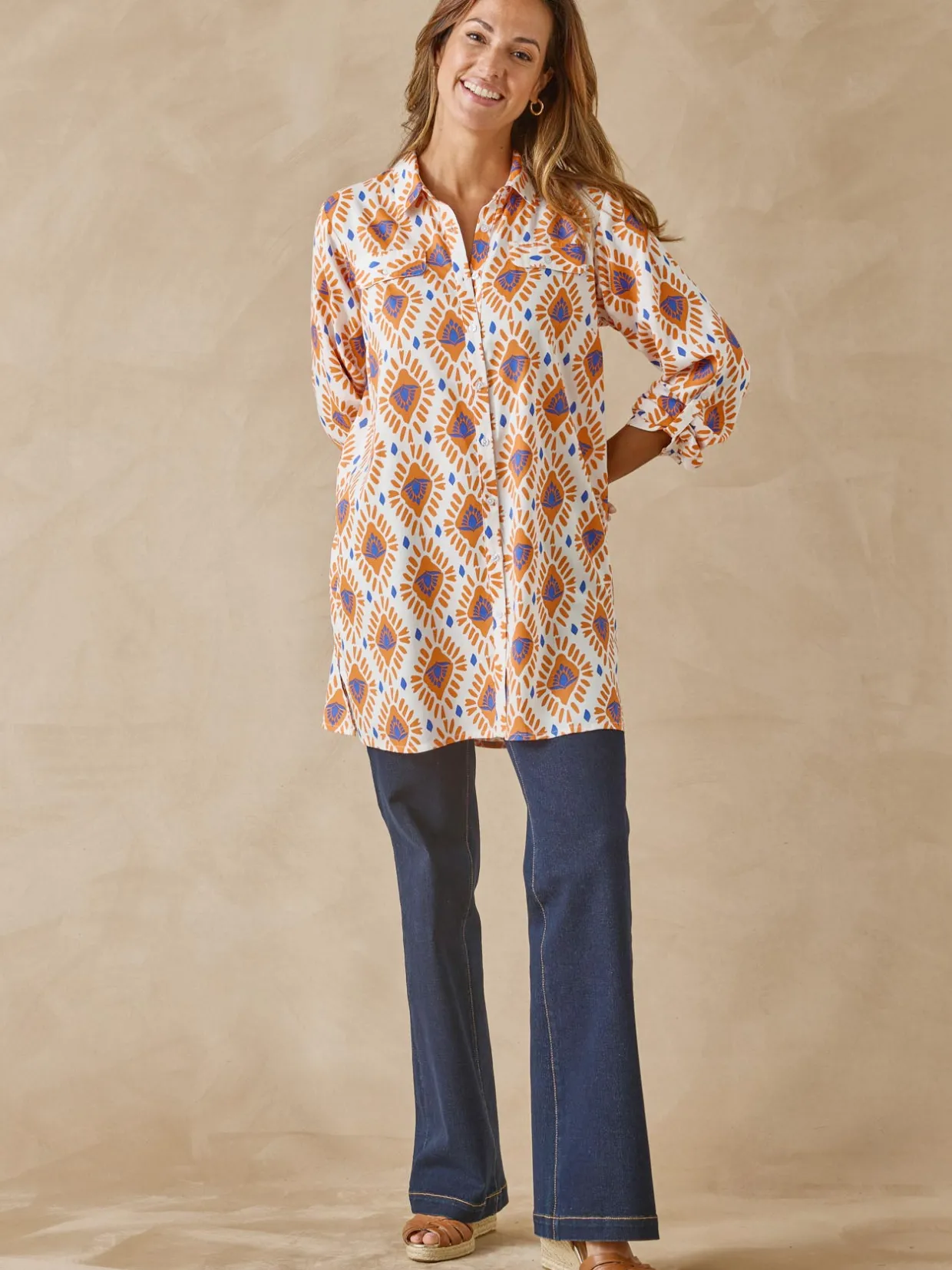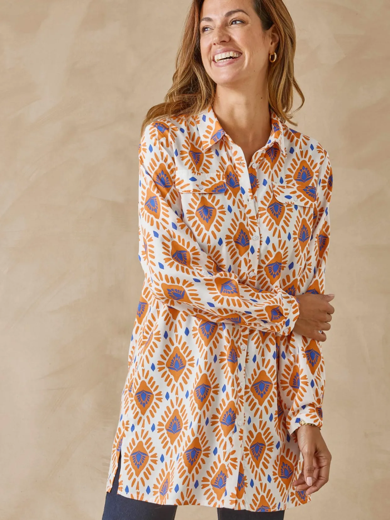 Une belle longueur et des fentes côtés qui vous permettent de porter ce chemisier tunique imprimé sur un jean slim ou un legging pour composer une tenue actuelle et facile à vivre.