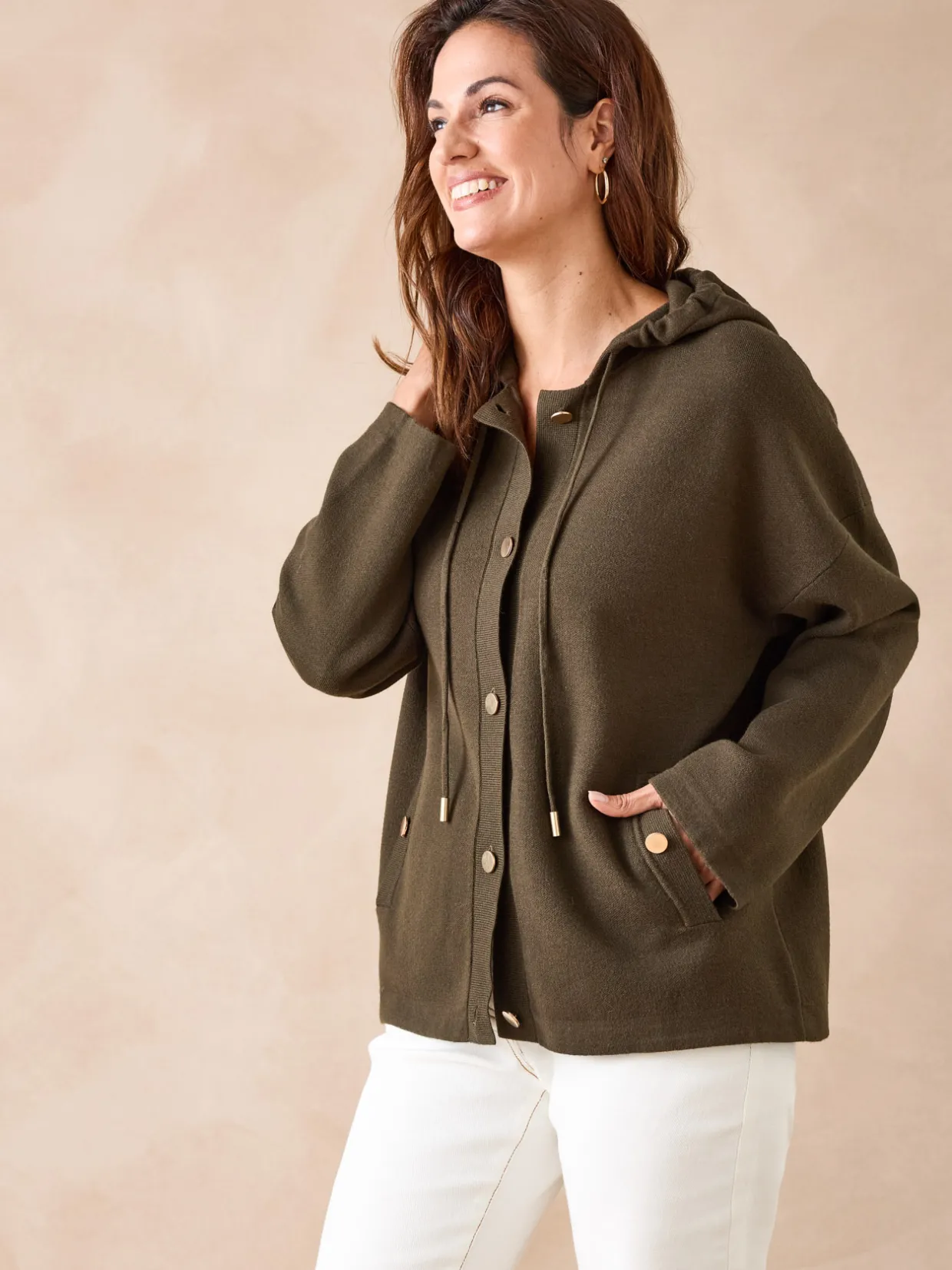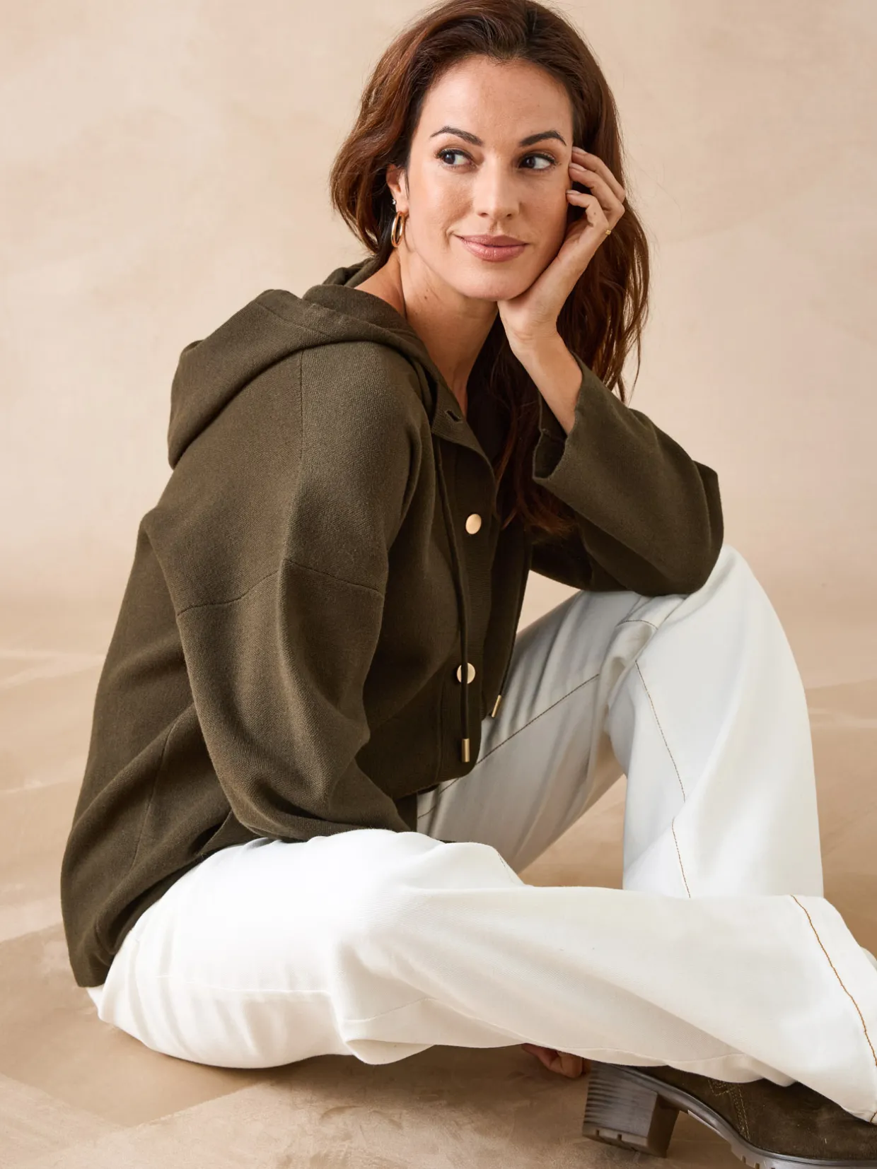 Le gilet à capuche s’offre un petit look citadin très sympa avec sa maille milano et ses détails dorés. Quant à son coloris kaki, il est pile dans la tendance !