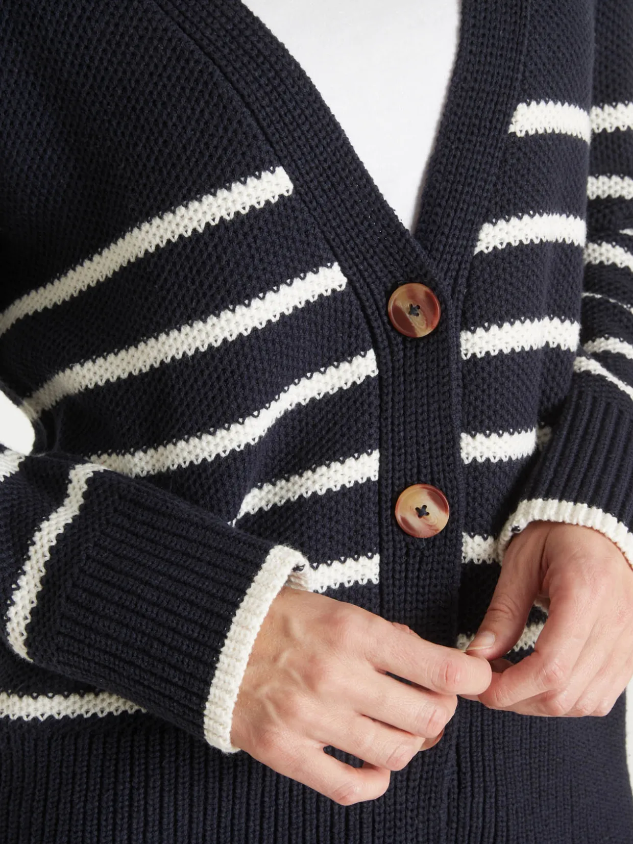 Le gilet V emprunte à l’esprit marin de jolies rayures, on approuve ! Un gilet rayé facile à assortir à associer à de nombreuses tenues, qui joue la fantaisie d’une maille à point fantaisie.
