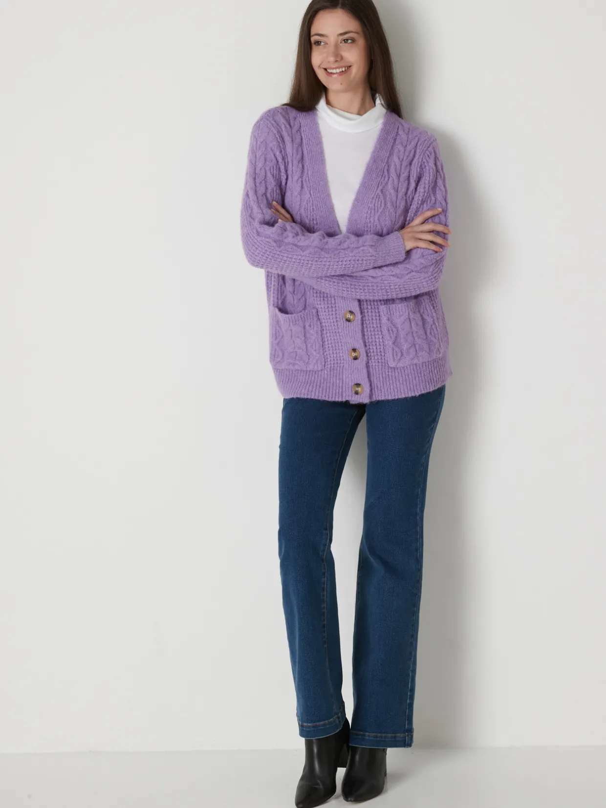 La maille de ce gilet V révèle un jeu de torsades sur des côtes perlées et s’enrichit de laine. Bien long, le gilet torsadé masque les petites rondeurs avec style !