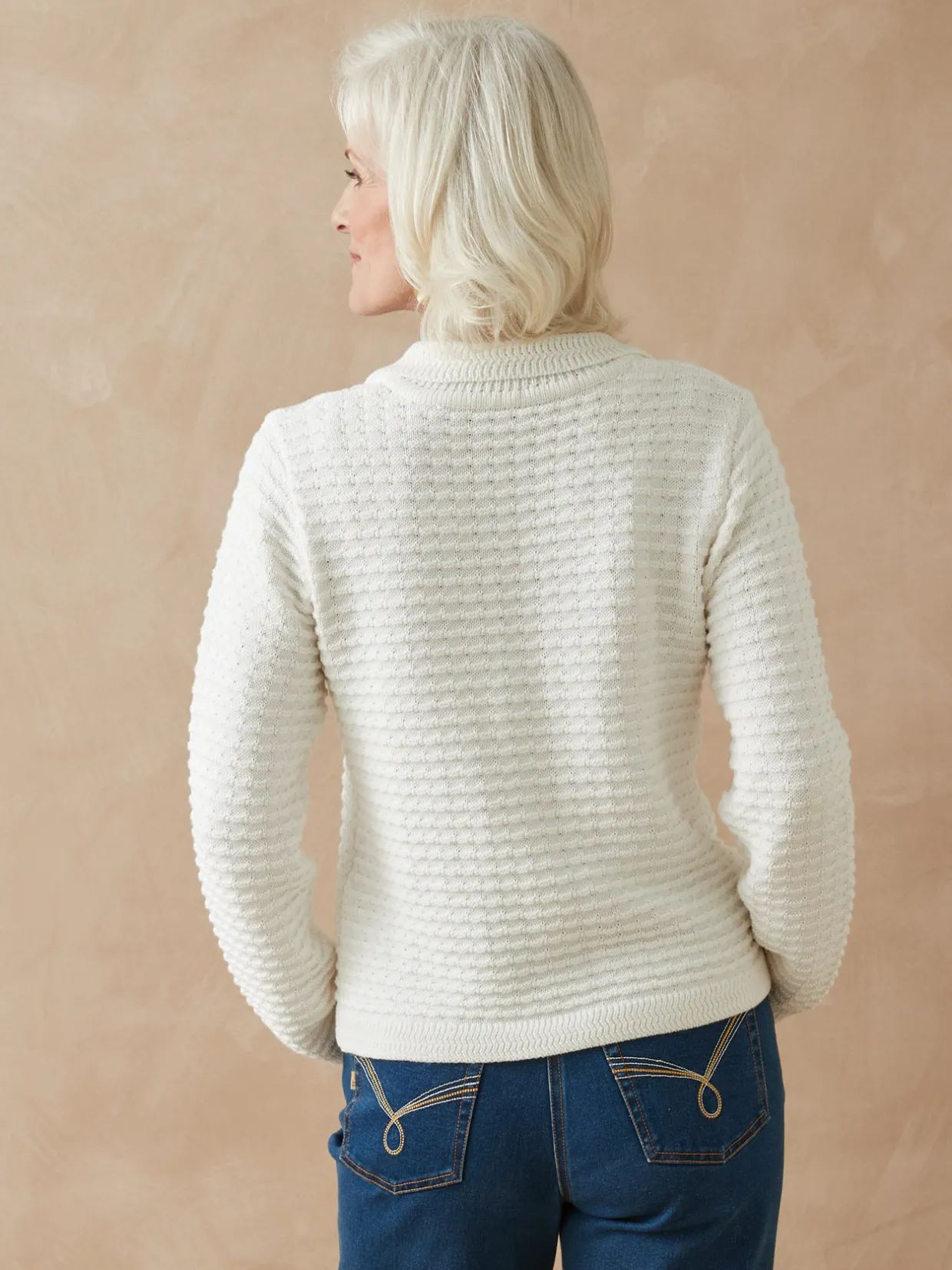 – Bord-côtes avec point fantaisie au col, dans le haut des 2 poches avec bouton, au bas des manches et à la base