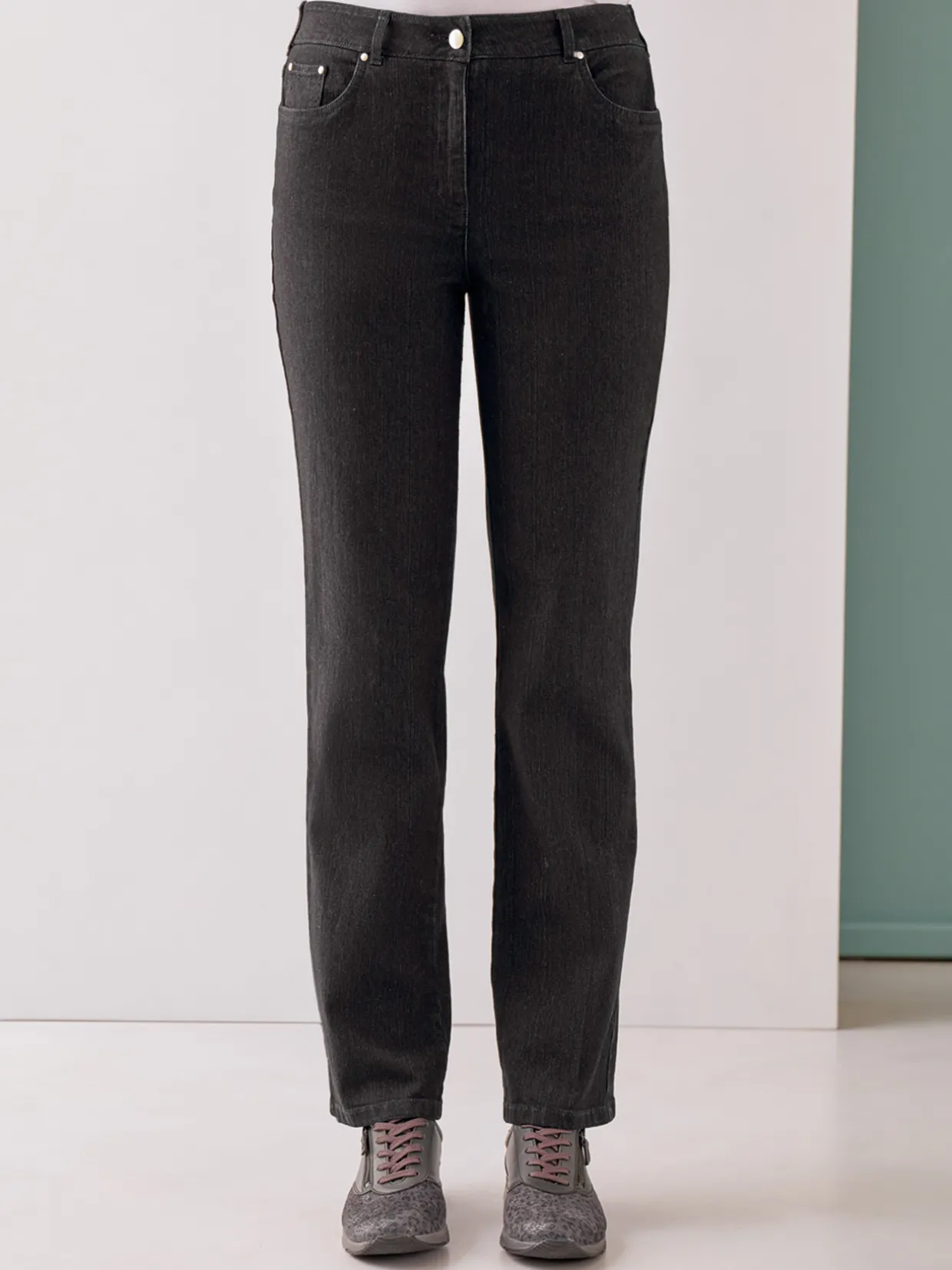 Coupe droite. Taille haute. Ceinture à passants, fermée par bouton et zip sous braguette, élastiquée côtés. Rehausse dos. 2 poches + 1 poche ticket devant à rivets, 2 poches plaquées avec broderies et strass au dos.