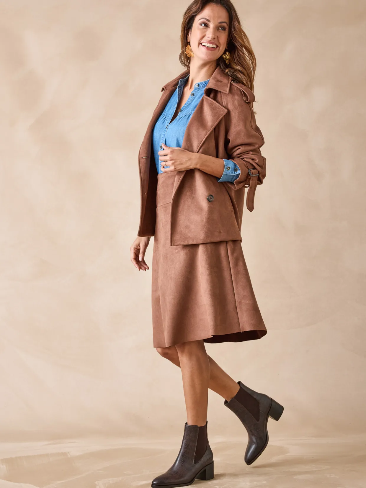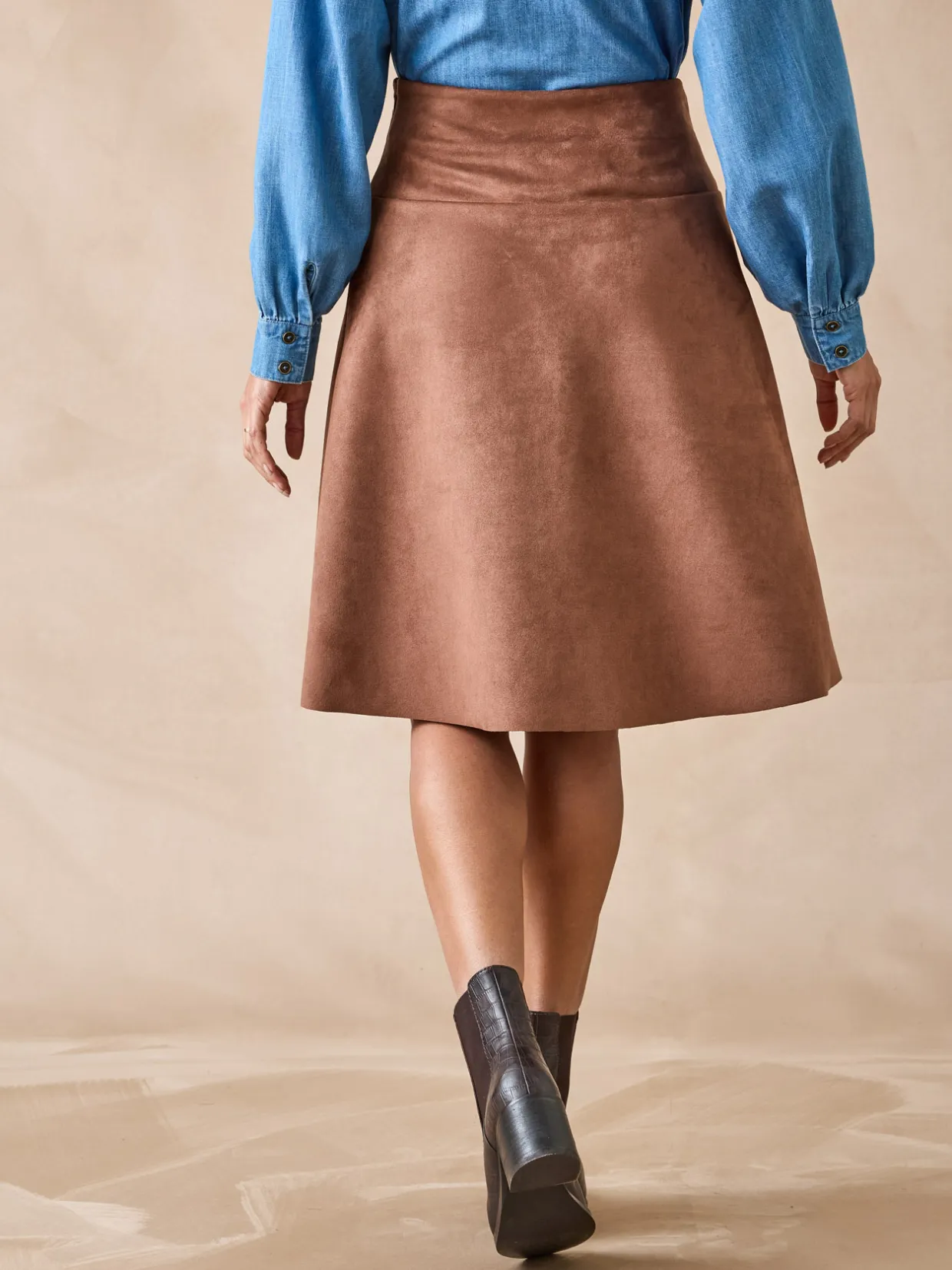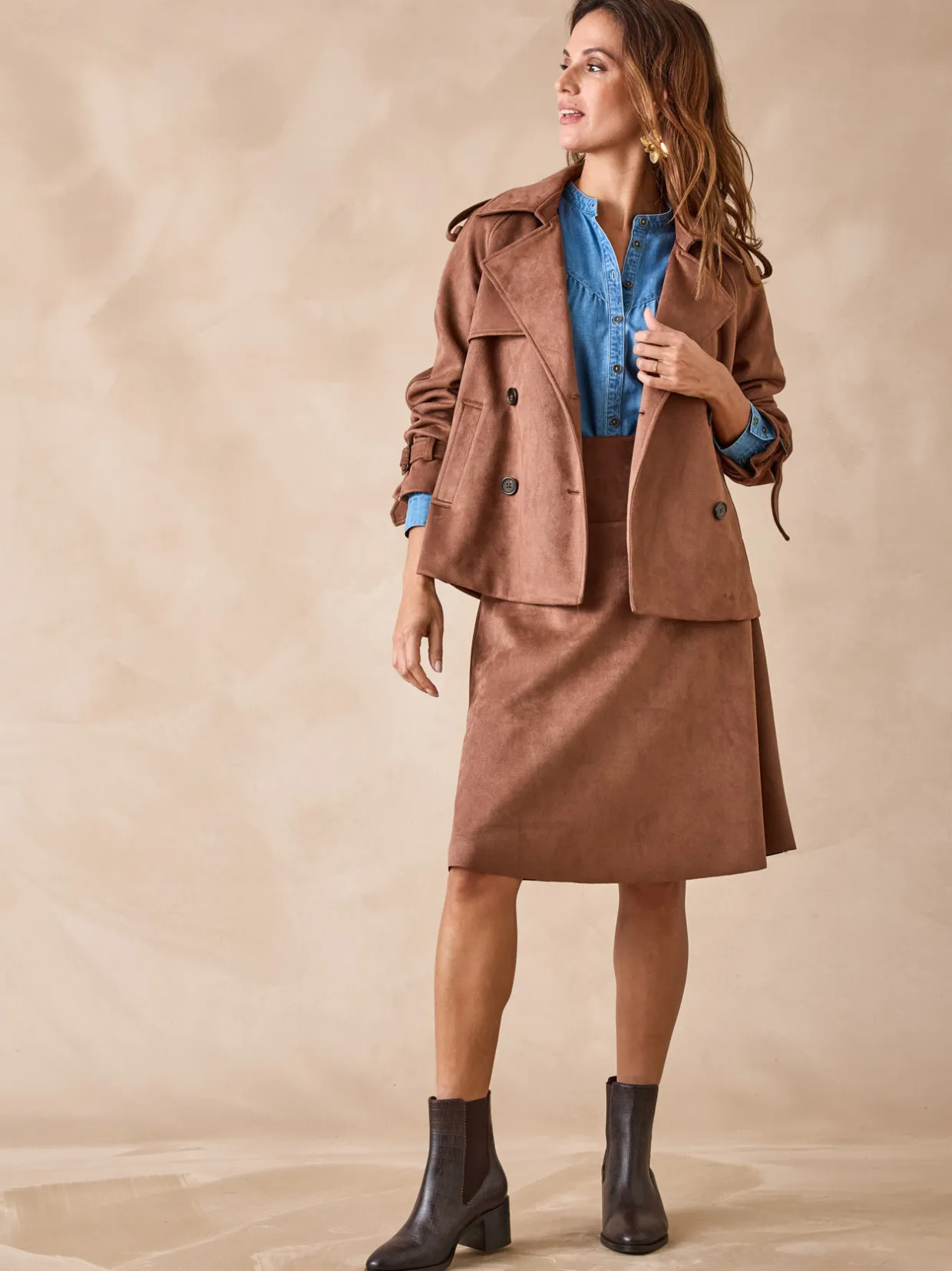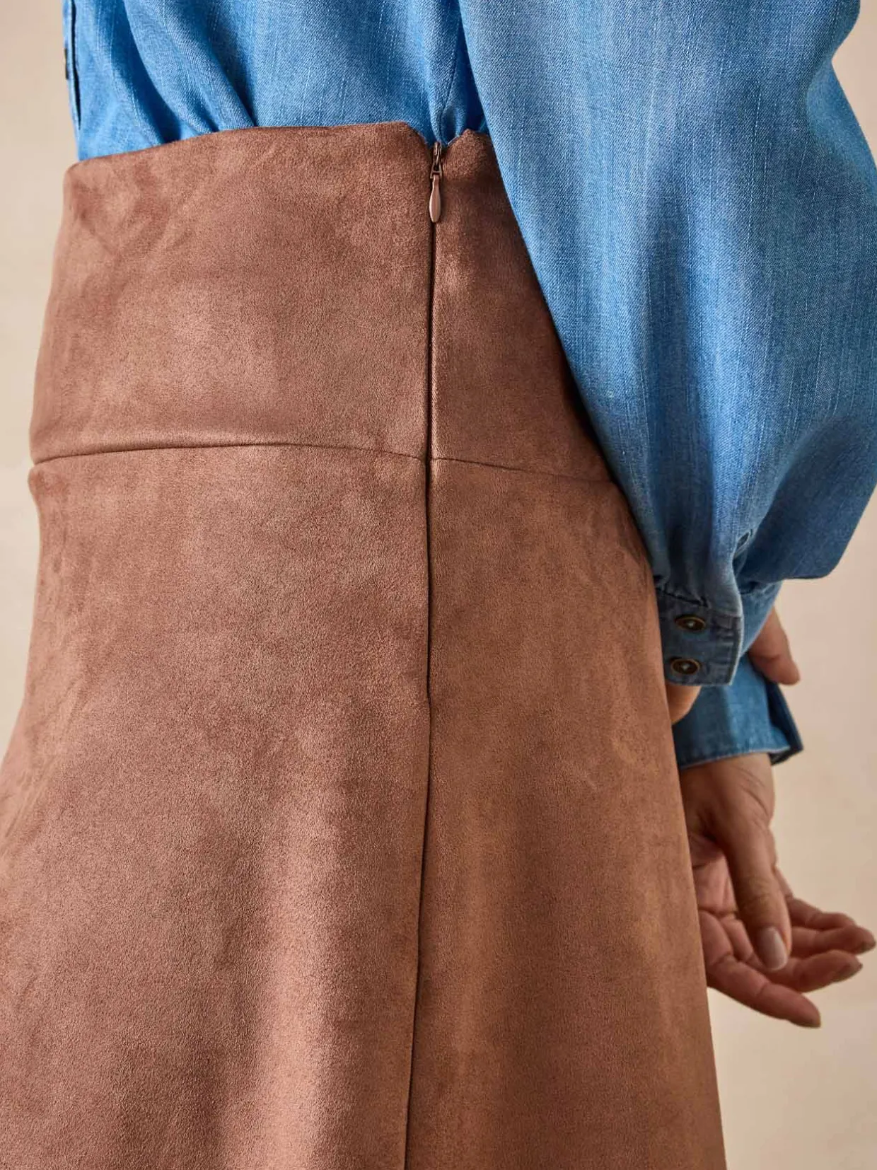 Une coupe légèrement évasée, une suédine douce et agréable à porter et un coloris facile à associer : autant d’atouts qui font de cette jupe une petite pépite du dressing de saison.