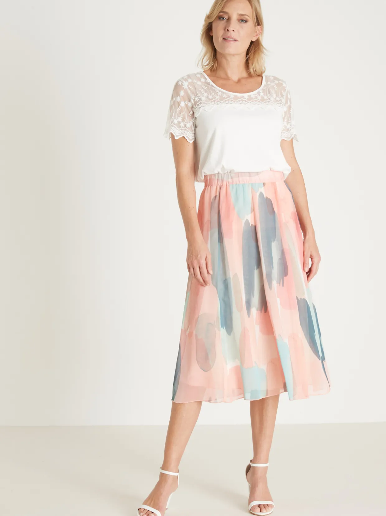 Un peu de légèreté dans le dressing avec cette très jolie jupe imprimée esprit « coups de pinceau ». Elle est confectionnée dans un voile aérien très agréable. Associée à une jolie blouse unie ou un petit tee-shirt raffiné, cette jupe évasée compose une tenue parfaite pour vos sorties.